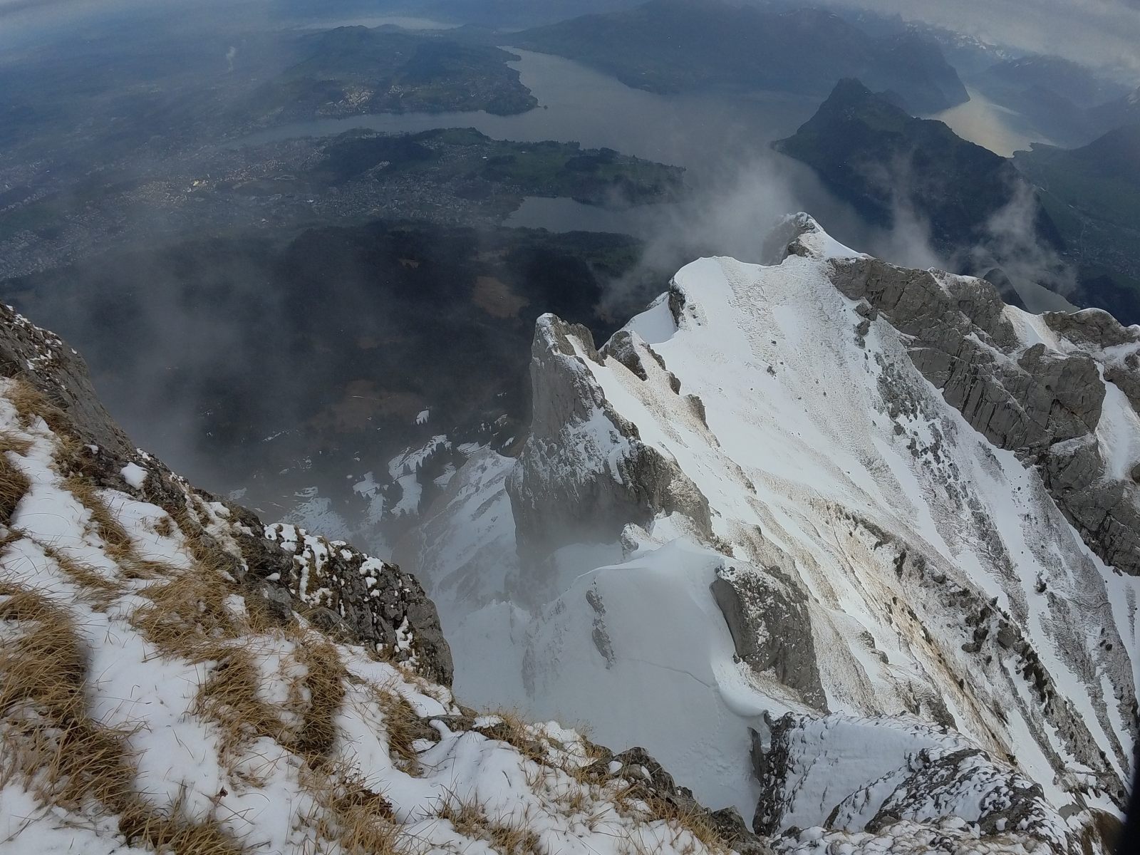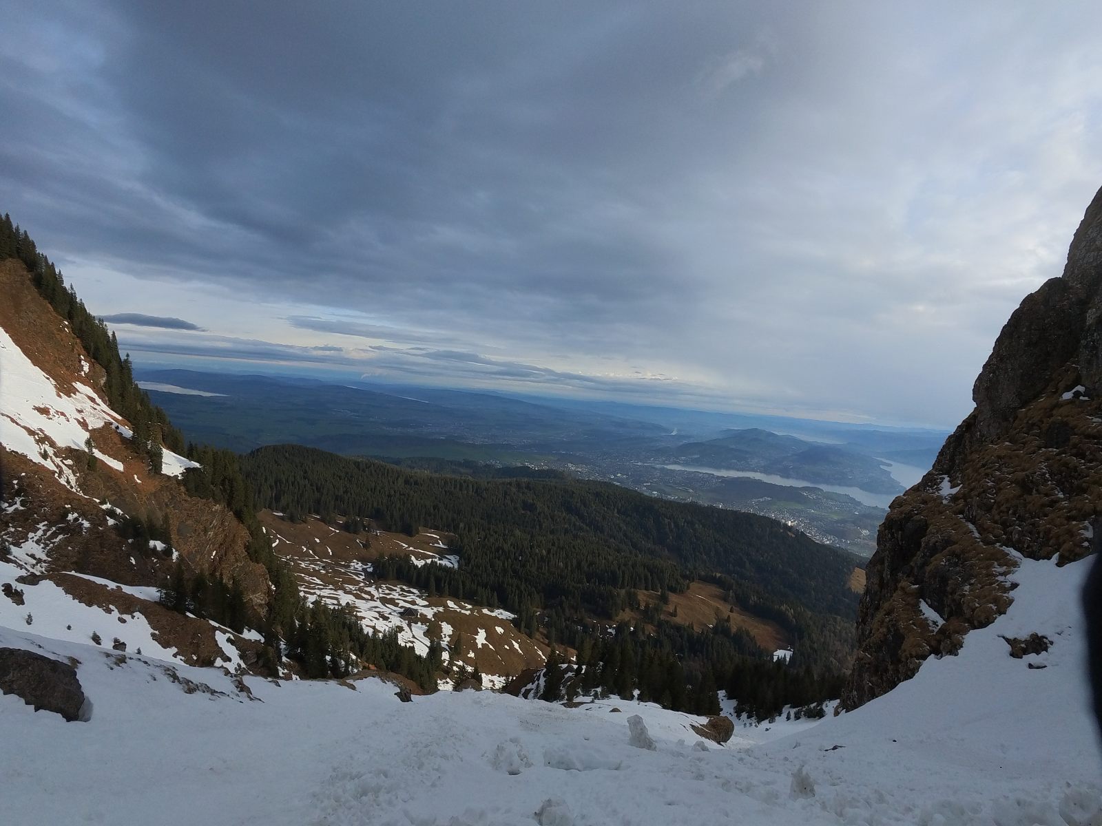 Es ist noch dunkel, als ich wenig über dem Vierwaldstättersee aus dem Zug steige. Eine gute halbe Stunde später bin ich bei der Tal- und nochmals soviel später bei der Bergstation der Lufsteilbahn zur Alpgschwänd. Wie es der Name sagt wurde hier einst der Wald gerodet, und der Weg führt mehrheitlich über offenes Wiesengelände. Darüber ändert sich das Bild deutlich. Zuerst geht es steil durch Bergwald hoch, bevor die Treichenmatte gequert wird. Diese ist von etlichen steilen Runsen durchzogen, die mit Lawinenschnee gefüllt sind. Steigeisen sind noch nicht notwendig, ein Pickel in der Hand hingegen schon. Als ich auf einer Umgehungsvariante durch lichtes Gestrüpp den Spuren folge, liegt plötzlich eine unversehrte Banane vor meinen Füssen. Vermutlich ist sie kürzlich aus einem Rucksack gefallen, und ich nehme sie dankbar als Abwechslung zu meinem Proviant.
