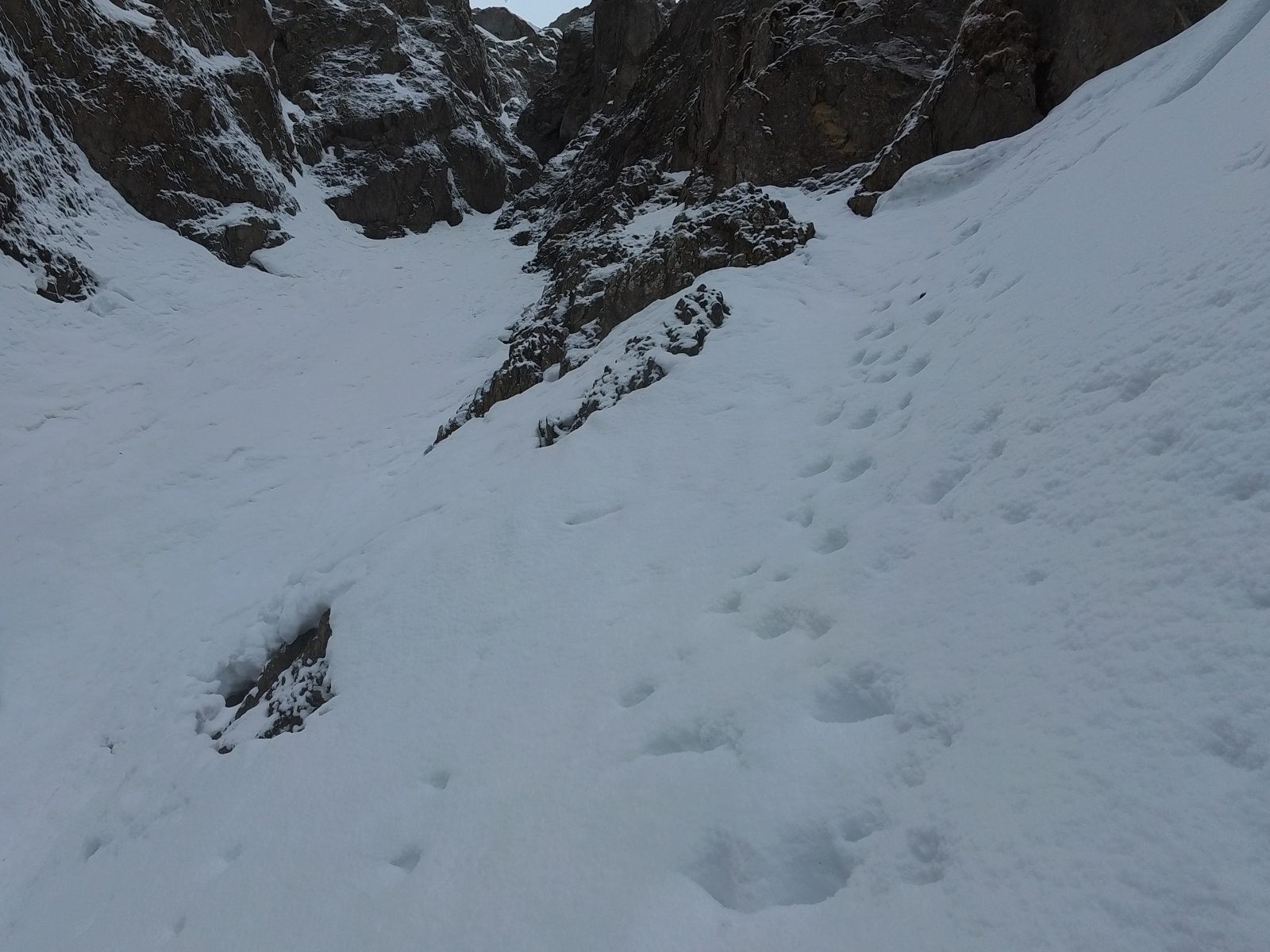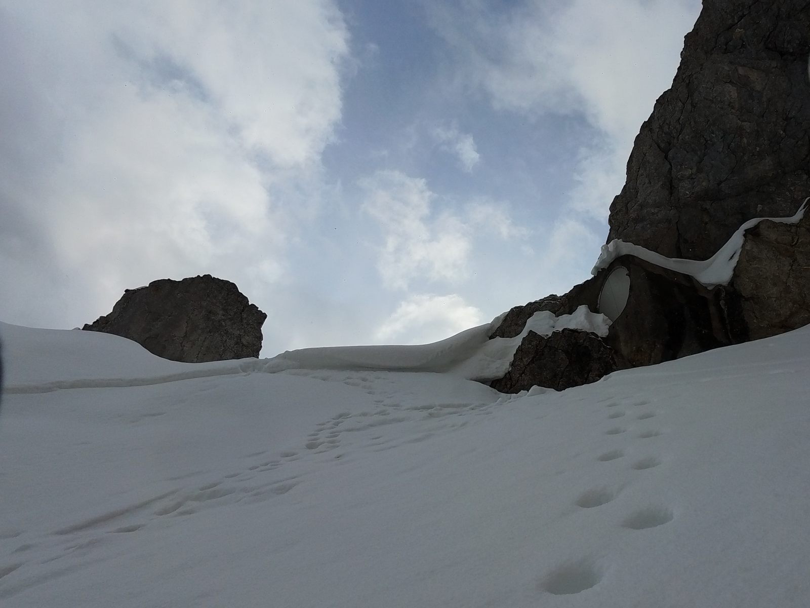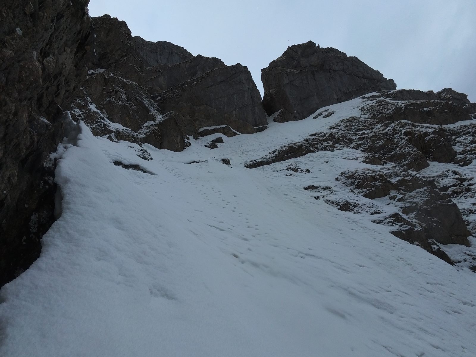 Im unteren Teil des Nauens ist dann der Moment für Znüni, Steigeisen und Helm. Das Gemäuer der Rosegg-Nordwand steht eindrücklich über mir, ohne jedoch eine furchteinflössende Nordwandatmosphäre zu verströmen. Finster ist nur der bewölkte Himmel, die Felsfluh hingegen ist hell und trocken, und ich verspüre Neugier, wo sich der eigentliche Einstieg in den Kulmchrachen verbirgt. Hinter einem Felsschild zieht sich dieser diagonal nach rechts hoch und windet sich dann zunehmend gegen links. Der Aufstieg steilt sich in der Folge unmerklich auf, bis ich beschliesse, dass zwei Pickel durchaus angebracht sind. Die Spur ist teilweise zugedeckt, und meine halbsteifen Leichtschuhe sind nur bedingt für harte Verhältnisse geeignet. Stellenweise gibt es durchaus solche, aber insgesamt befindet sich alles auf der gutmütigen Seite.