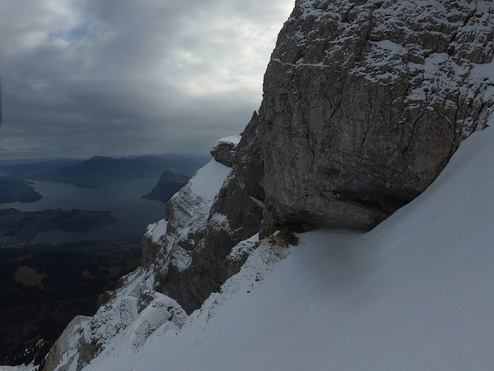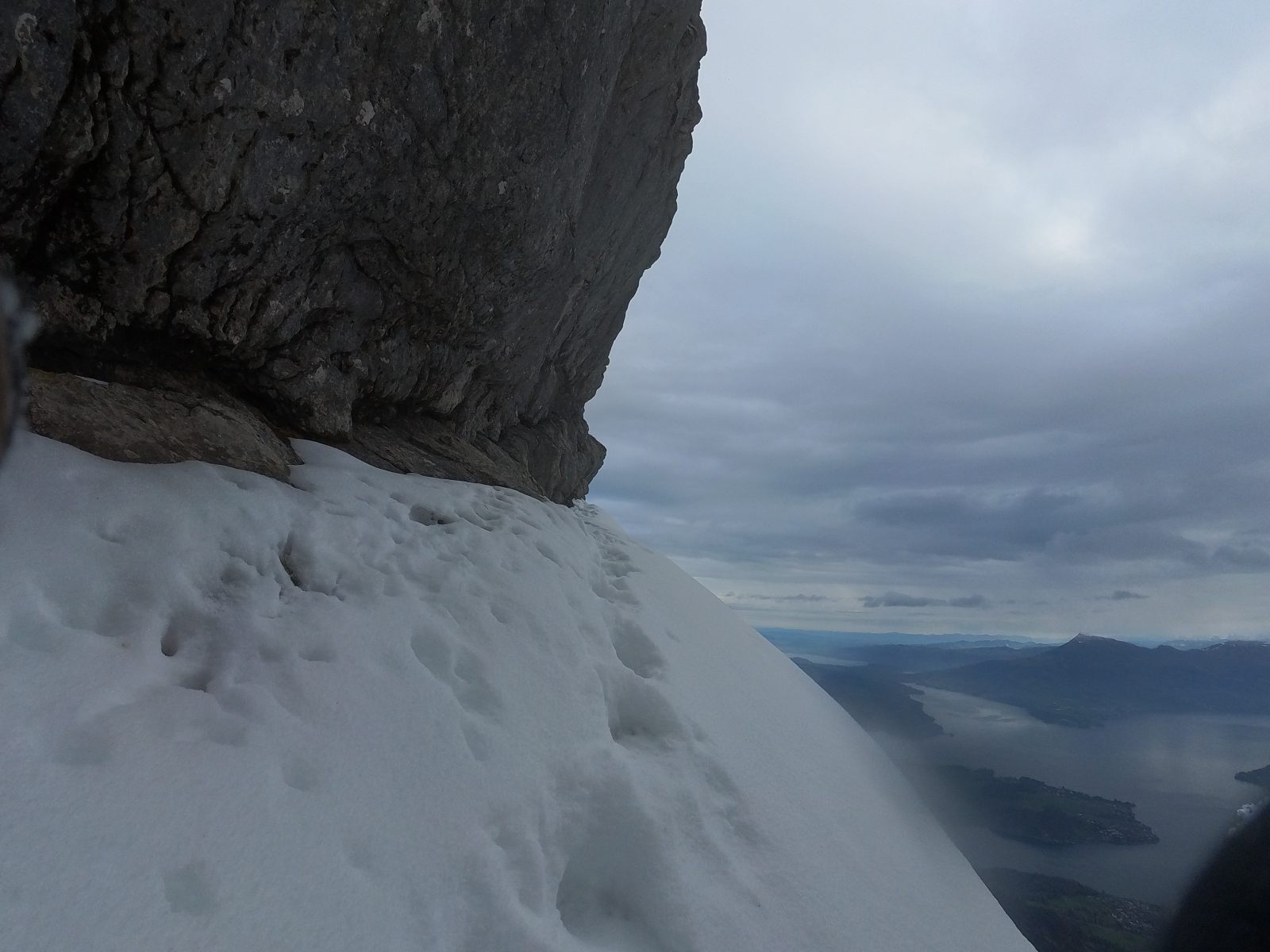 Krachen tut es in der Route durch die Nordwand des Pilatus bei den aktuellen Verhältnissen glücklicherweise nicht. Nach ergiebigen Schneefällen herrschten während der letzten beiden Wochen Hochdruckwetter, wo die Schneeschicht über Nacht auskaltete und tagsüber nur wenig auftaute. Bis es mir in den Kram passt, haben sich diese perfekten Verhältnisse leider schon fast wieder verabschiedet. Eine Niederschlagsfront bringt Bewölkung, welche die nächtliche Abstrahlung verhindert. Immerhin wird es aber deutlich kühler, sodass die Verhältnisse noch genügend sicher sein sollten für diesen Klassiker.