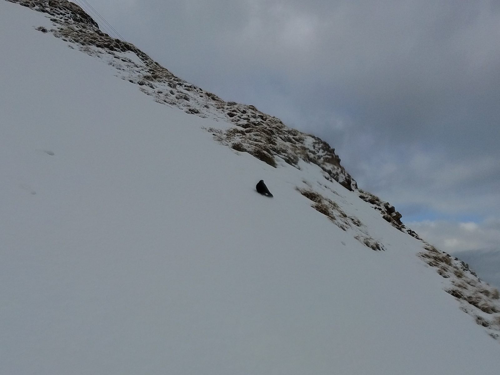 In einer Beschreibung wird im Zusammenhang mit dieser Variante gewarnt: “Nur gut bei guter Firnlage und wenn Sonne noch nicht da!”. Ehrlich gesagt, halte ich dies im Moment für etwas übertrieben, denn der letzte Aufstieg liegt noch lange Zeit im Schatten des Rosegg. Den mehrheitlich südseitig ausgerichtet Aufstieg auf den Esel kenne ich vom Sommer und habe ihn als unproblematisch in Erinnerung. Eine kurze Querung ums Eck bringt einen in die Rinne mit den (Militär-)Installationen und ist praktisch aper. Also Steigeisen weg, Pickel aufgepackt und locker zum Gipfel hoch. Vorsichtshalber doch noch den Alupickel hinter den Rücken stecken. Man weiss ja nie!