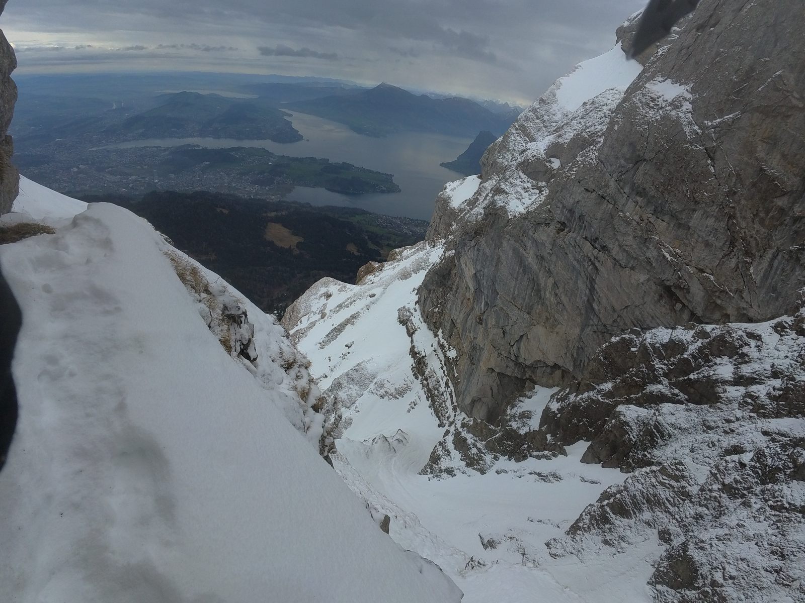 Der Aufstieg zur ersten Querung auf ca. 1900 ist ebenso unproblematisch wie die Querung rechts hinaus zum Routenbuch selber. Der Schnee ist griffig und fest. Darüber erblickt man zum ersten Mal die Installationen auf dem Pilatus Kulm. Rund hundert Höhenmeter später entscheide ich mich für die linke, die zum Sattel östlich des Esels leitet. Das vielzitierte Kriechband lässt sich diesmal aufrechten Ganges bewältigen, weil sich die Pickel sehr sicher in der kompakten Schneeauflage versenken lassen. Mit den letzten Spreizschritten erreicht man wieder den eigentlichen Kulmchrachen und folgt dem Firn bis in den Sattel. Die Wächte ist schon soweit abgetragen, dass das Übersteigen keine Probleme bereitet.