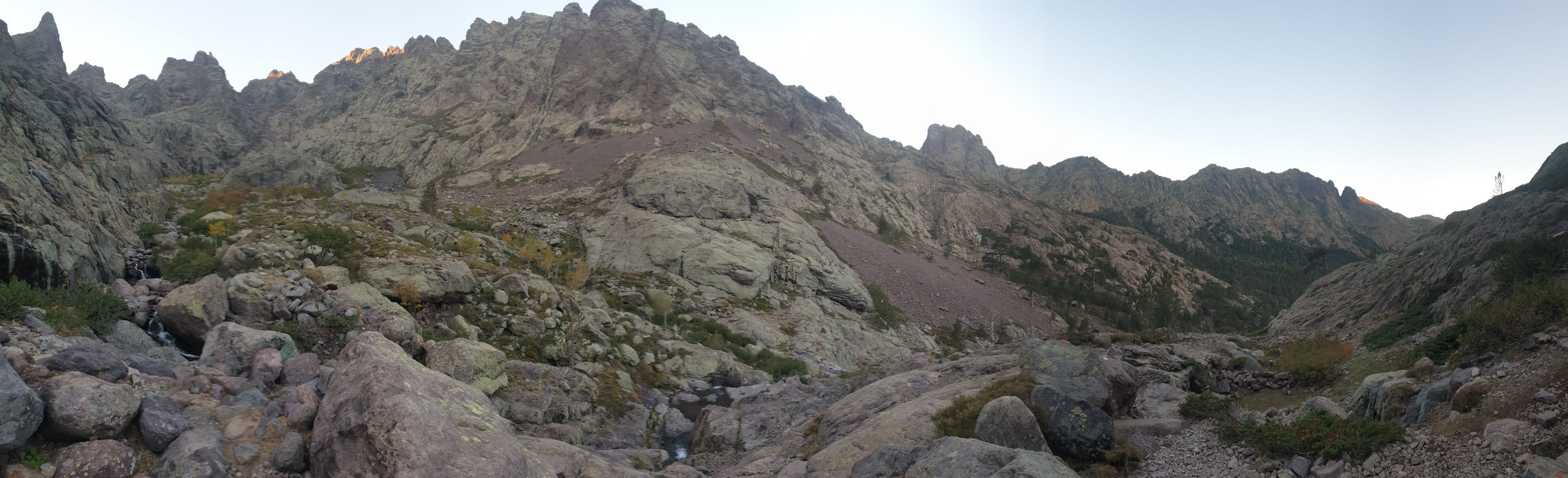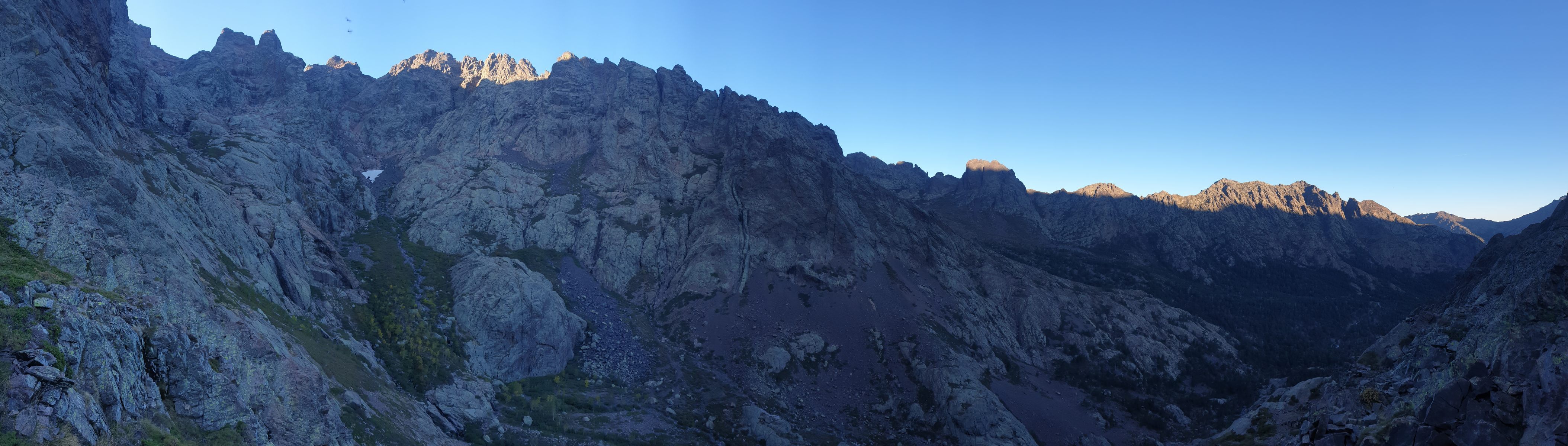 4. Etappe von Asco Stagnu zum Refuge Tighiettu (9+1200-100) inklusive Abstecher auf den Monte Cinto, mit 2706 m.ü.M. der höchste Punkt von Korsika (zusätzlich 2+150-150). Belaufbarkeit im Mittelteil und im Aufstieg zum Monte Cinto B3, davor und danach B2. Wasser allenfalls beim Seelein südlich der Bocca Borba auf 2300. Am Morgen lange im Schatten; Schnee bleibt im nordseitigen Anstieg zur Pointe des Éboulis lange liegen.