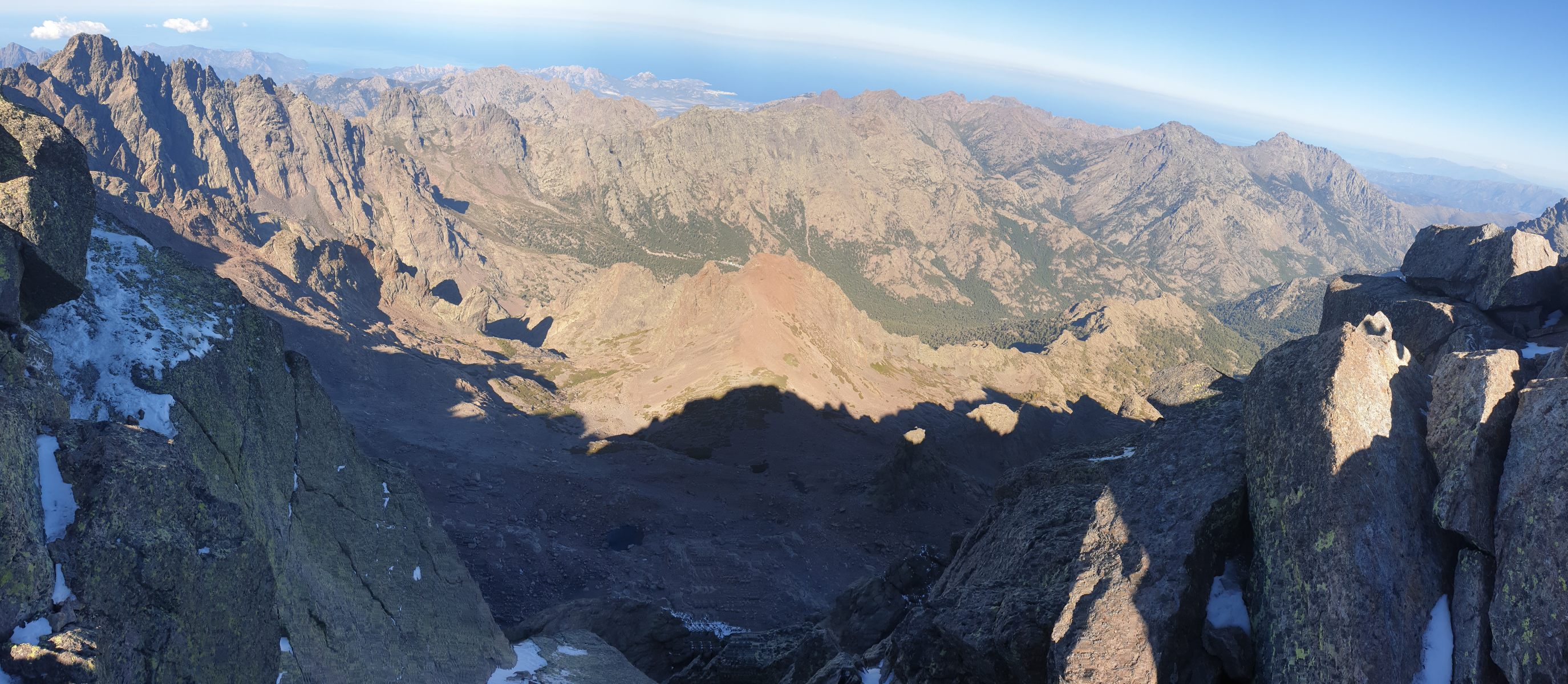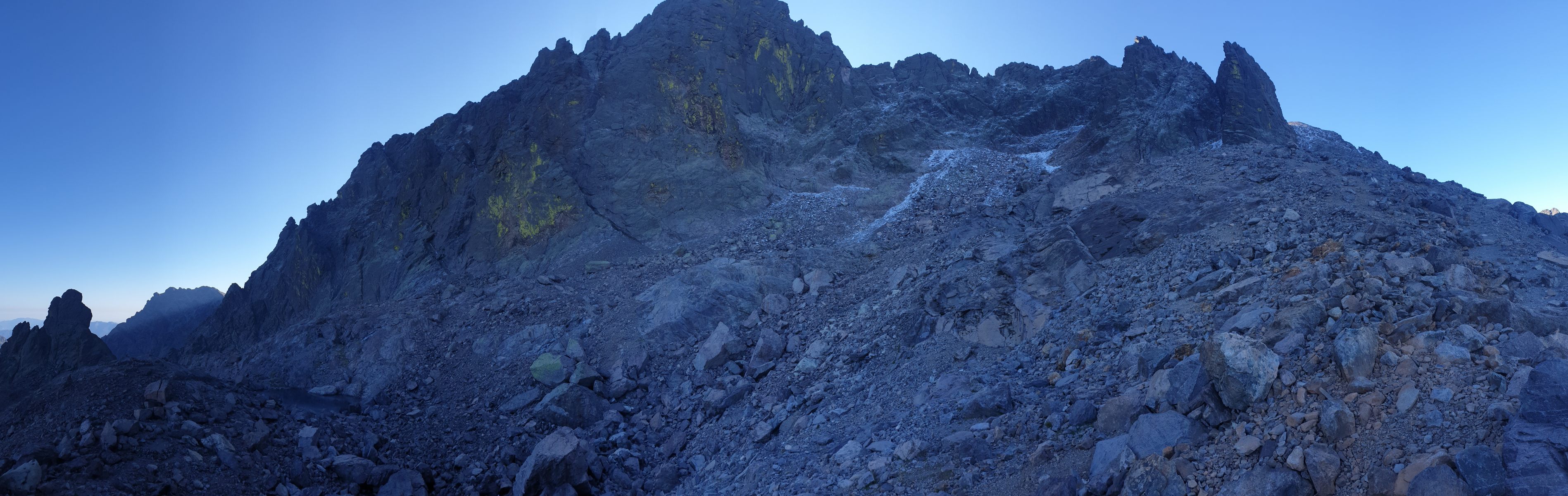 Der Aufstieg zur der Pointe des Éboulis ist technisch nicht weiter anspruchsvoll. Schon am Vorabend war jedoch von der Bocca di Stagnu aus ersichtlich, dass die Nordflanke des Cinto Massivs von den Niederschlägen der vergangenen Wochen überzuckert war. Der Weg war mit einer dünnen, harten Schneeschicht überzogen. Mit Trailschuhen war das noch machbar; einen Abstieg hätte ich jedoch als eher heikel eingestuft. — Allgemein kann das Wetter auf dem “Dachfirst” von Korsika wohl recht rauh sein.