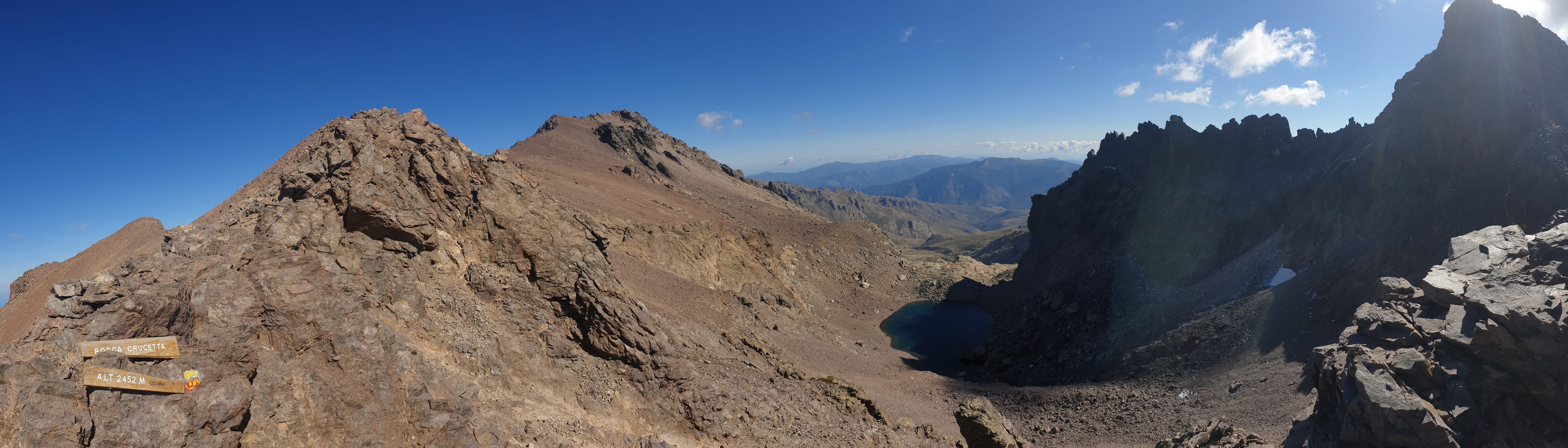 Zurück auf der Brèche des Éboulis (ca. 2580) folgt der Weg der Geröllflanke hinüber zur Bocca Crucetta (2452); auch hier ist das Gelände noch recht alpin, jedoch ohne Kraxelei. Von der Bocca geht es weiter durchs Geröll rassig hinunter in Richtung Refuge de Tighiettu (1680).