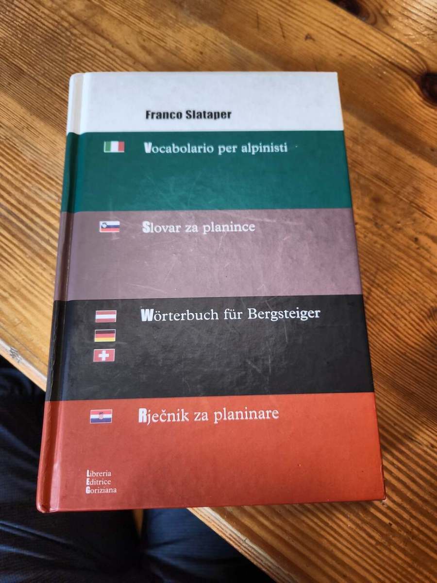 Alpinistisch relevant sind pot für Weg und – essentiell im Karstgebirge – okno für Fenster (und nicht etwa der Name eines lokalen Bergsportvereins, wie auch anfänglich vermutete); man wird also irgendwo einen Durchschlupf erwarten. Leicht zu merken ist dom für Gasthaus (oder einfach koča für Hütte). A propos Hütten: Diese tragen ellenlange Namen Planinski dom pri Krnskih jezerih oder Koča na planini Kuhinja. Auf der erstgenannten Hütte lag das “Wörterbuch für Bergsteiger” von Franco Slataper (Verlag Liberia Editrice Gorziana, ISBN 88-86928-39-4) auf, mithilfe dessen ich meinen Grundwortschatz anlässlich eines verregneten Nachmittags von fünf auf fünfzehn Wörter katapultieren konnte. Planina heisst Alp(-en) und planinski dom demzufolge Alpgasthaus, koča na planini entsprechend Hütte auf der Alp. Der wesentliche Teil des Hüttennamens findet sich dann jeweils gegen Ende. Kuhinja ist vermutlich der Name der Alp, und weil jezero See bedeutet, heisst pri Krnskih jezerih etwa “beim Krnsee”.