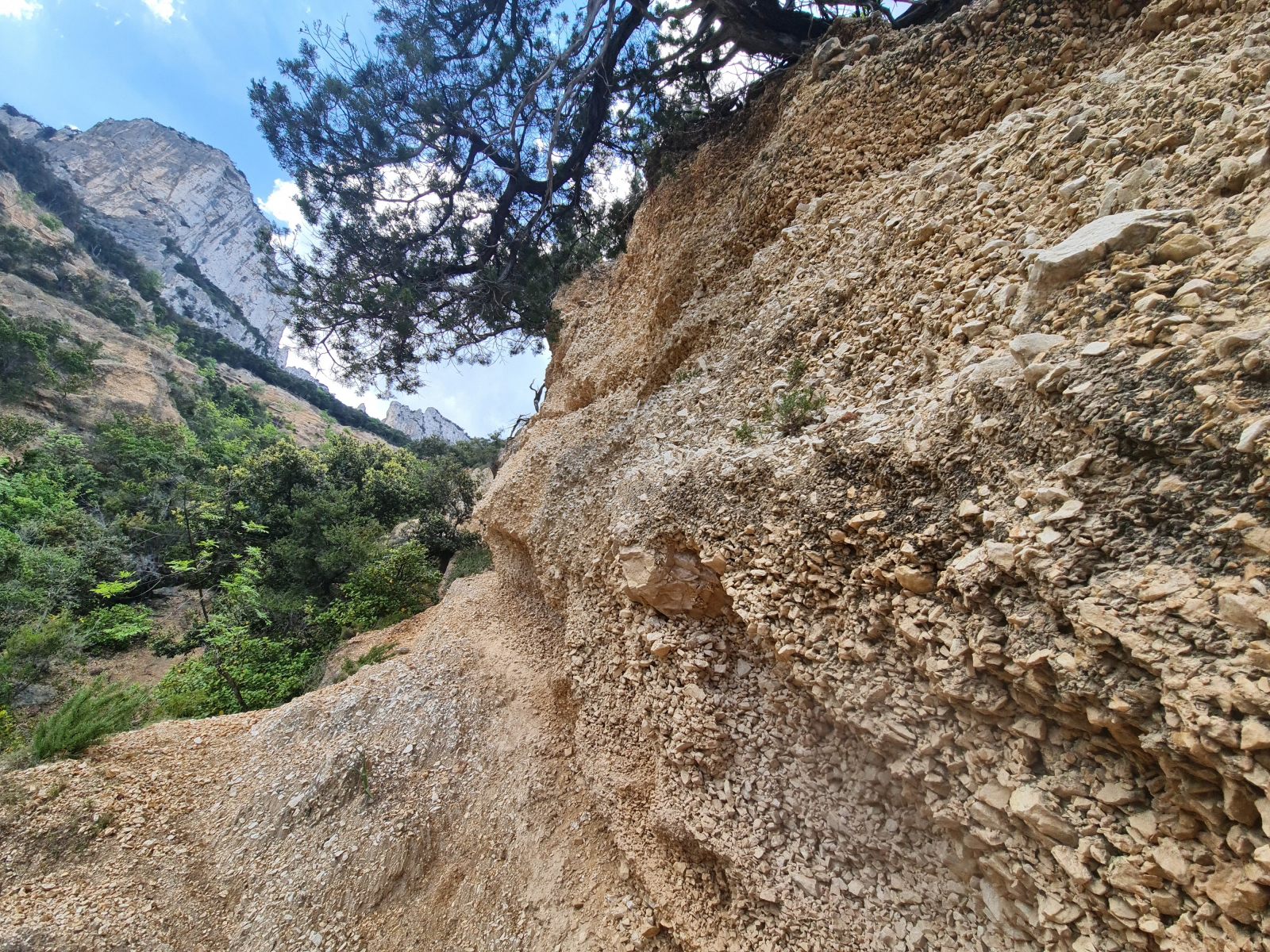 Ein schmaler Pfad führt hinüber zu den sog. hängenden Bäumen, einer Ansammlung von krumm gewachsenen Bäumen. Einerseits ist es ja gut, dass in diesem Geröll überhaupt Bäume wachsen, andererseits zeigt die Wuchsform auch die Bewegung des Untergrunds auf. Von dort traversiert man die steilen Flanken über Stock und Schutt. Drei tief eingeschnittene Runsen sind zu überwinden, und da und dort sind Seile installiert; ab und zu sind damit auch bloss Äste fixiert, entlang derer hinunter gekraxelt werden muss. Das vergrössert den Unterhaltungswert beträchtlich, was allerdings gar nicht notwendig wäre, denn das Gelände allein ist anspruchsvoll genug. Ohne Fixseile möchte ich es nicht begehen, und auch so verlangt es volle Konzentration. Eine letzte, steile Geröllhalde wird überwunden, ehe man bei grossen Halbhöhe ankommt, welche schon von der Cala aus sichtbar ist.