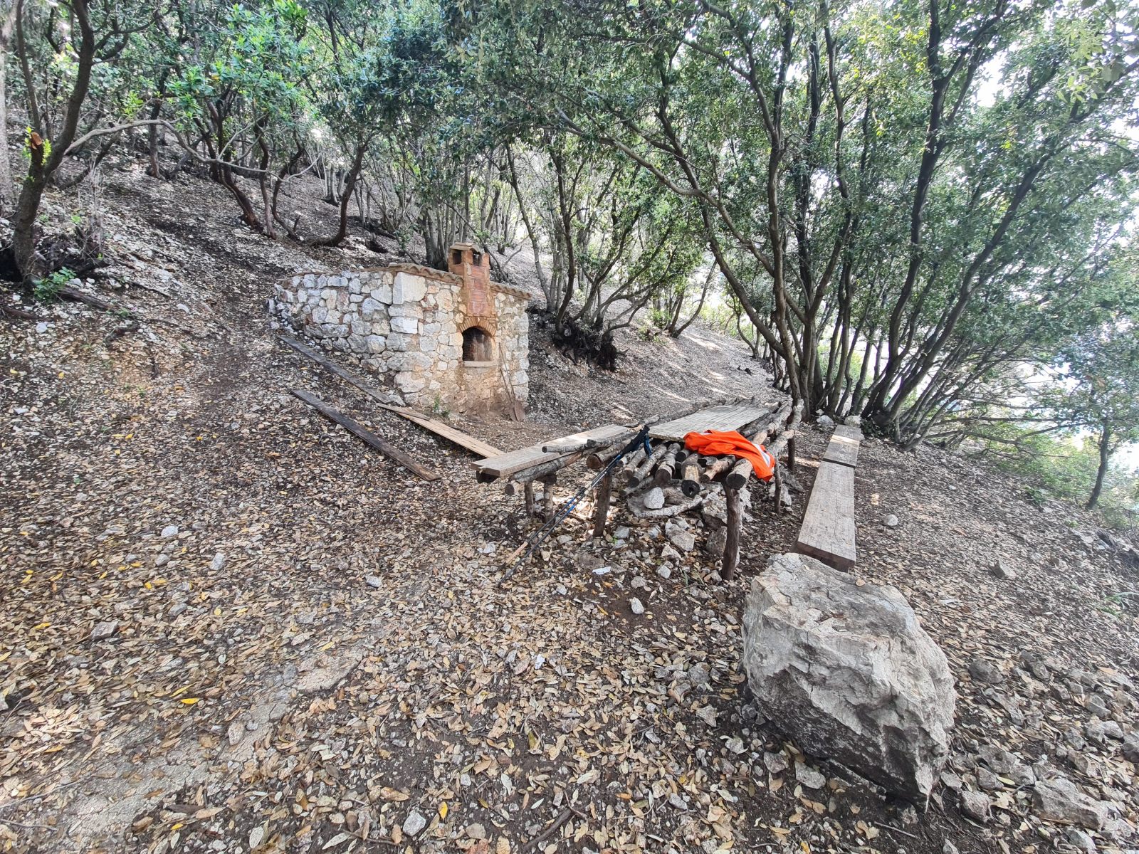Unten angekommen, entdecke ich eine Festbankgarnitur um einen Pizzaofen herum im Wald über der Felsküste. Folgt man der Küste weiter, leitet eine wacklige Baumleiter zur nördlichen Bucht. Jene sieht wunderschön aus, aber ich bin ja nicht zum baden her gekommen. Von einem Weiterweg ist überhaupt nichts auszumachen. Also wieder zurück nach oben und dann von dort aus weiter auf dem Originalweg! Ich geniesse es, auf dem breitem Weg hochzulaufen und endlich wieder einmal richtig auszuziehen. Vom Rucksackdepot habe ich mir die Höhe eingeprägt, aber ich werde es auch so erkennen, wenn ich daran vorbeikomme — meine ich. In Tat und Wahrheit will und will das Depot einfach nicht kommen, und dann beginne ich auch noch, die Fakten so zu interpretieren, dass sie zu meinen Erwartungen passen. Erst als ich etwas zweihundert Höhenmeter zu hoch bin, realisiere ich, dass zwei verschiedene Wege in die Cala hinabführen müssen, und dass ich offenbar den Abzweiger verpasst haben muss. Das hat mir gerade noch gefehlt!