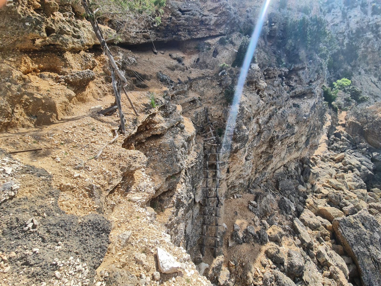 Zu meiner Überraschung nimmt gerade eine ganze Gruppe den Klettersteig in Angriff. Sie sind von oben über eine lange Abseilstrecke zugestiegen und wollen nachher auf meinem Zustiegsweg zur Cala Goloritzè hinüber. “NA, dann viel Vergnügen!” denke ich im Stillen. Von einem Auswärtigen lassen sie sich sowieso nichts sagen, und so bin ich froh, dass ich zwischendurch einsteigen darf. Der Klettersteig ist kurz, bloss etwa 30 Meter hoch. Zu Anfang traversiert man etwas abdrängend zur Kante hinaus, und der Rucksack macht sich störend bemerkbar. Nachdem man dieses Eintrittsbillet gelöst hat, kraxelt man an wunderbar griffigem Kalk hoch, wobei durchaus auch geklettert wird und nicht nur an Eisenbügeln hochgestiegen. Am senkrechten Ausstieg muss noch einmal kräftig zugelangt werden, bevor man sich in angenehmen Gelände wiederfindet.