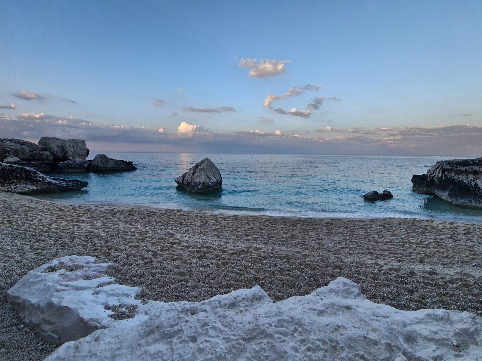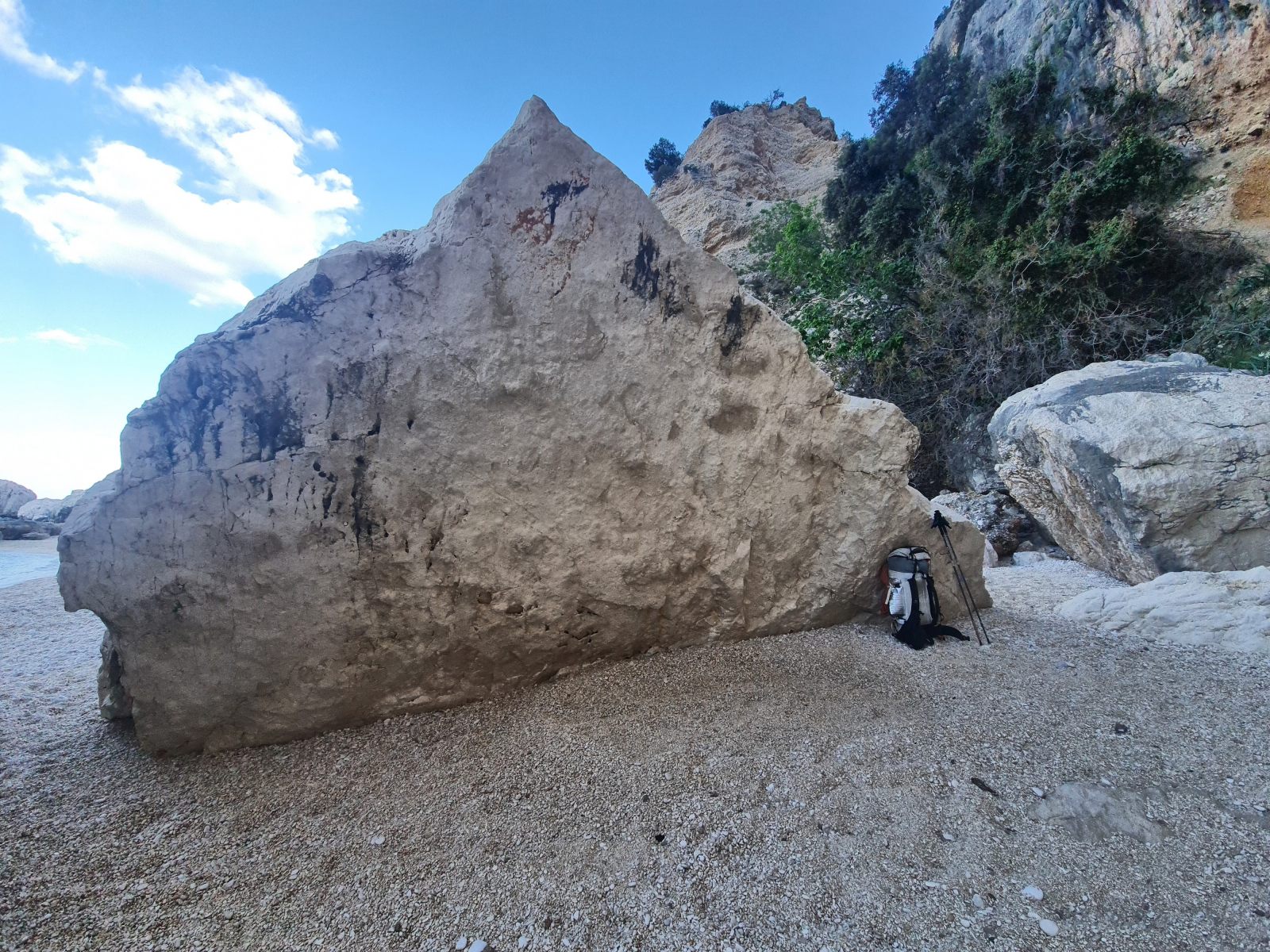 Das Missgeschick passt zum heutigen Nachmittag. Mir scheint, dass irgendetwas will, dass ich die Nacht in der Cala Mariolu verbringe. Manchmal muss man sich solchen Kräften einfach ergeben. Nach einigem Suchen finde ich die Abzweigung, welche von dieser Seite kaum zu erkennen ist. Endlich gelange ich zum Materialdepot, und trotte wieder zur Cala hinunter. Wegen meiner zusätzlichen Eskapaden ist die Zeit schon recht weit fortgeschritten, bis ich die nördliche Bucht erreicht habe. Auf dem makellos weissen Kieselstrand richte ich ein regengeschütztes Nachtlager ein, denn der Himmel ist immer noch bewölkt. Abgesehen von der Cala Goloritzè bin ich seit zwei Tagen keinem Menschen mehr begegnet, und auch jetzt bin ich mutterseelenallein. Mittlerweile bin ich etwas dürr, und es dauert eine kleine Ewigkeit, bis ich mich soweit installiert habe, dass ich das Abendessen in Angriff nehmen kann. Auf einem schönen Felsen über dem Meer kann ich zum ersten Mal etwas entspannen und meine Gedanken sammeln. Nicht für lange, denn um 20 Uhr steht der Playoff-Final im Eishockey an, den ich unbedingt schauen will. Mitunter war auch das ein Grund, dass ich mich nicht allzu heftig gegen die Übernachtung in der Cala Mariolu gewehrt hatte, denn der Handyempfang ist dort einwandfrei.