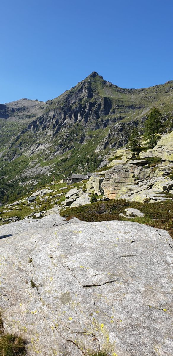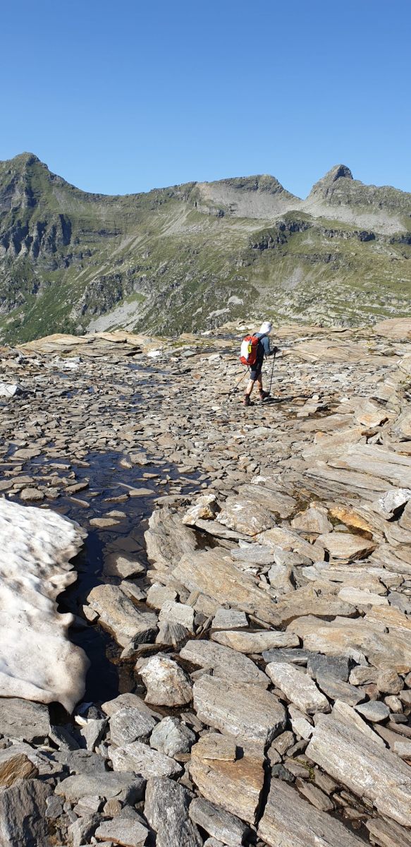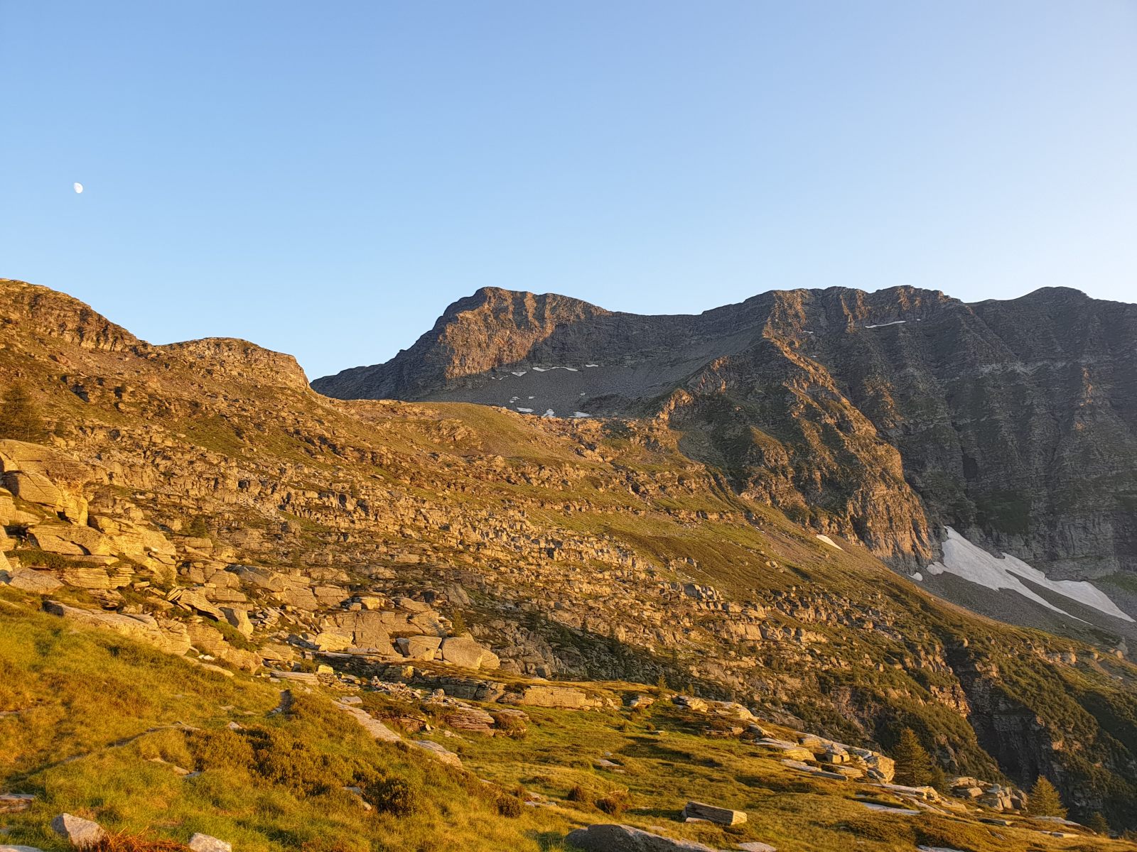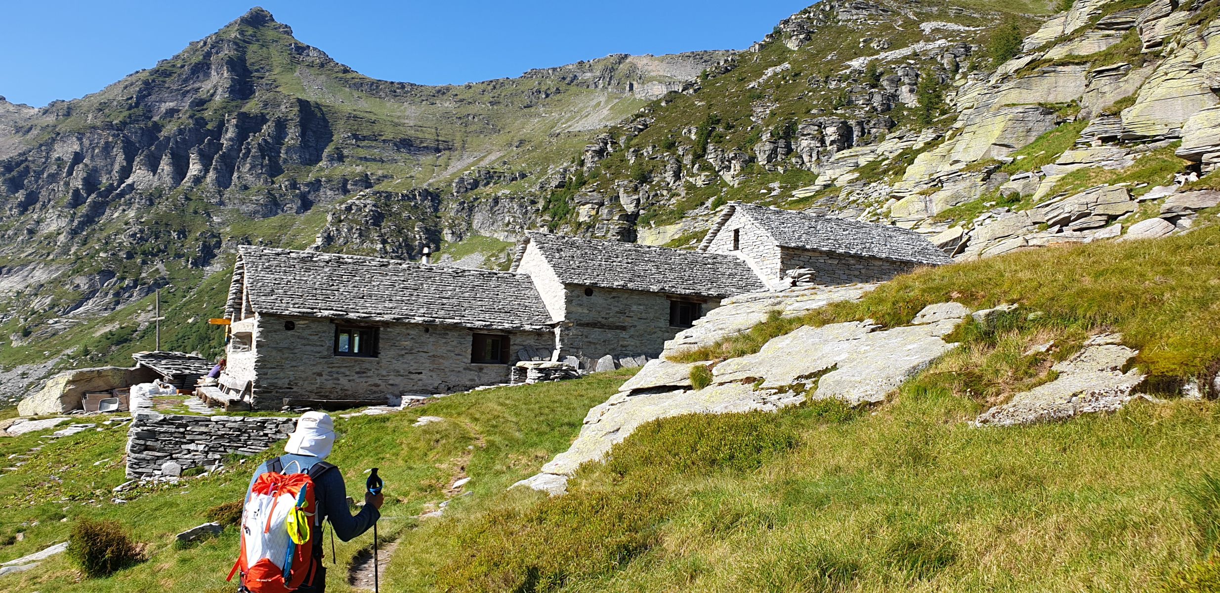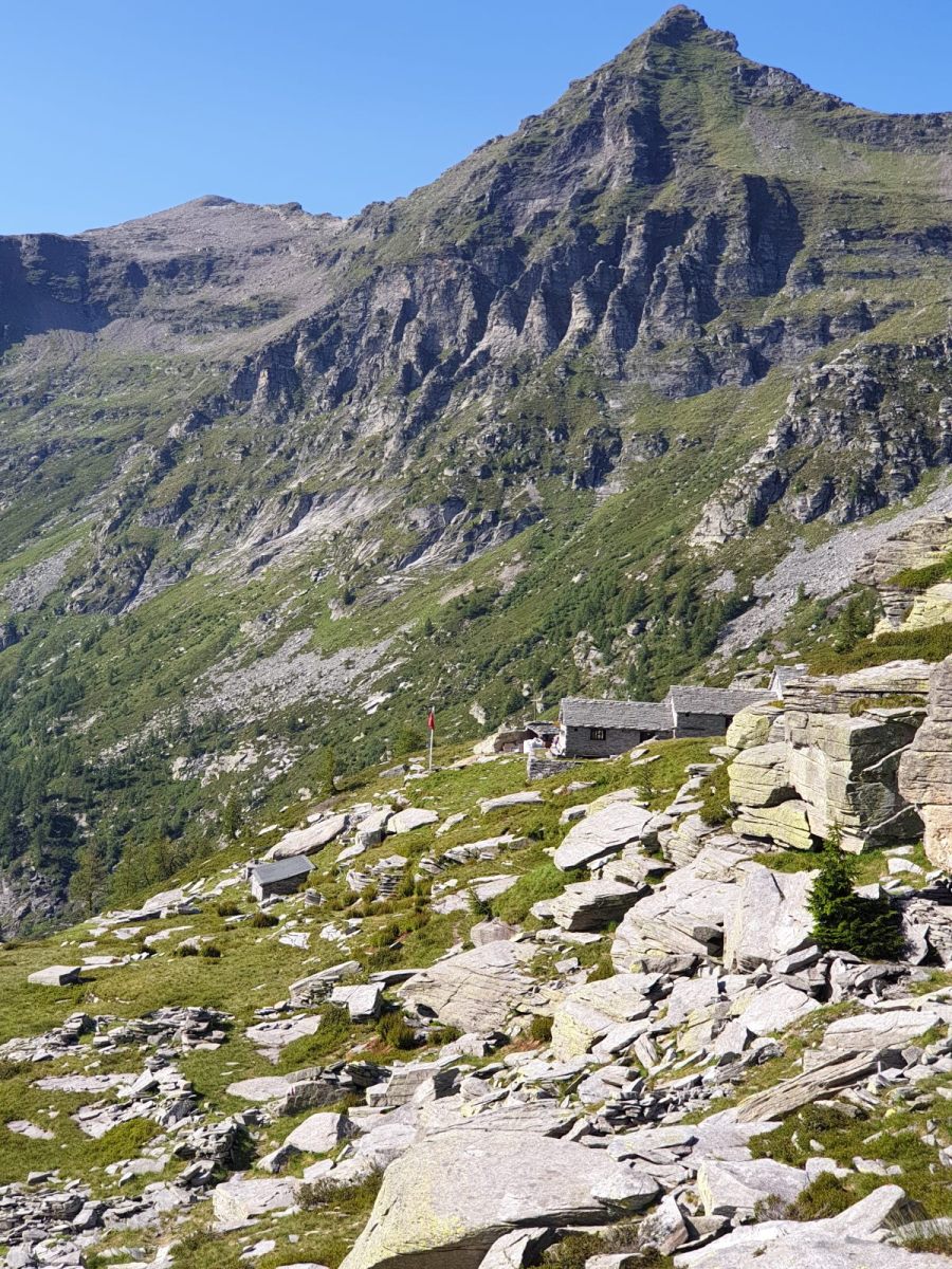 Mit der Bocchetta dello Scaiee hat man fürs Erste den westlichsten Punkt der ersten beiden Etappen erreicht. Danach quert man mit wenig Höhenverlust durch die steile und felsige N-Wand der Cima di Gagnone. Im Frühsommer kann da vermutlich noch recht lange Schnee liegen. Zum Passo di Gagno hinunter überquert man eine Schneetälchenlandschaft und lässt sich auf dem Wanderweg zur Capanna d’Efra tragen. Dort treffen wir auf viele Leute, welche die Hütte renovieren oder fürs leibliche Wohl der Handwerker sorgen. Es wird ein sehr gemütlicher Abend mit grünem Salat, rotem Wein und frischem Gemüse. Theoretisch könnte man noch ein Bad im Lago d’Efra nehmen, aber 200 Höhenmeter hin und zurück bräuchten beträchtlich viel Überwindung.