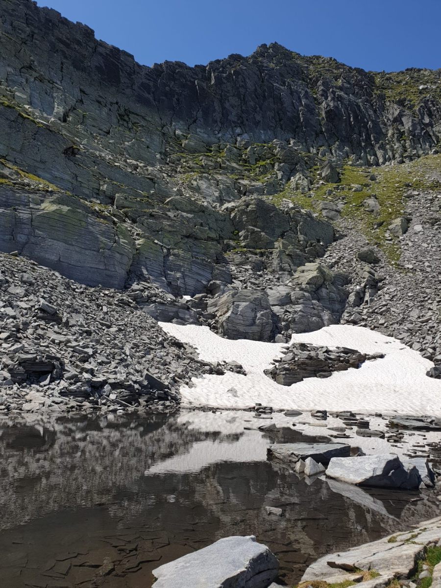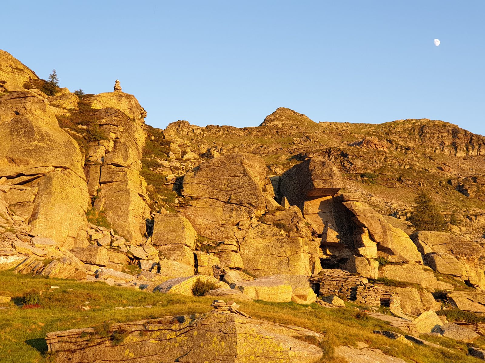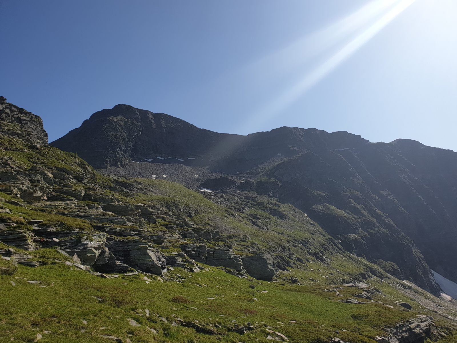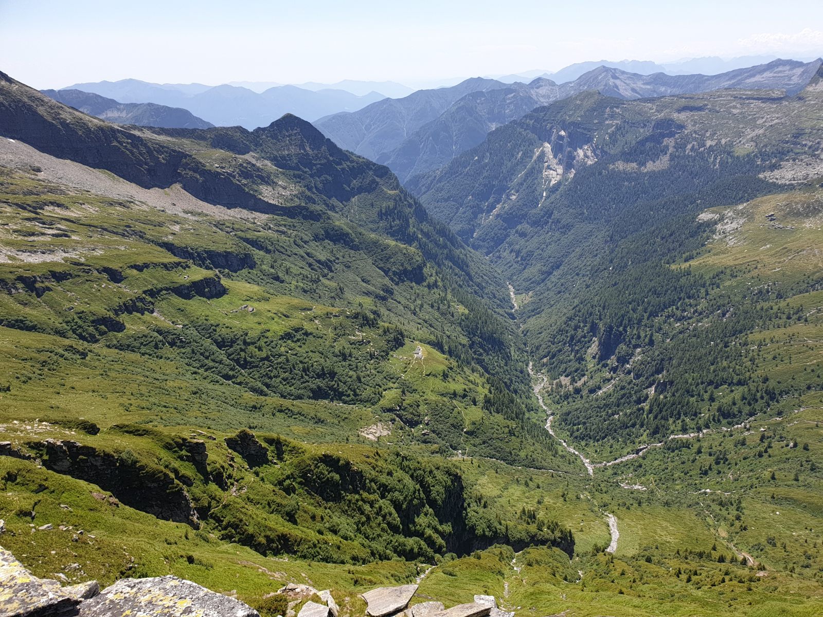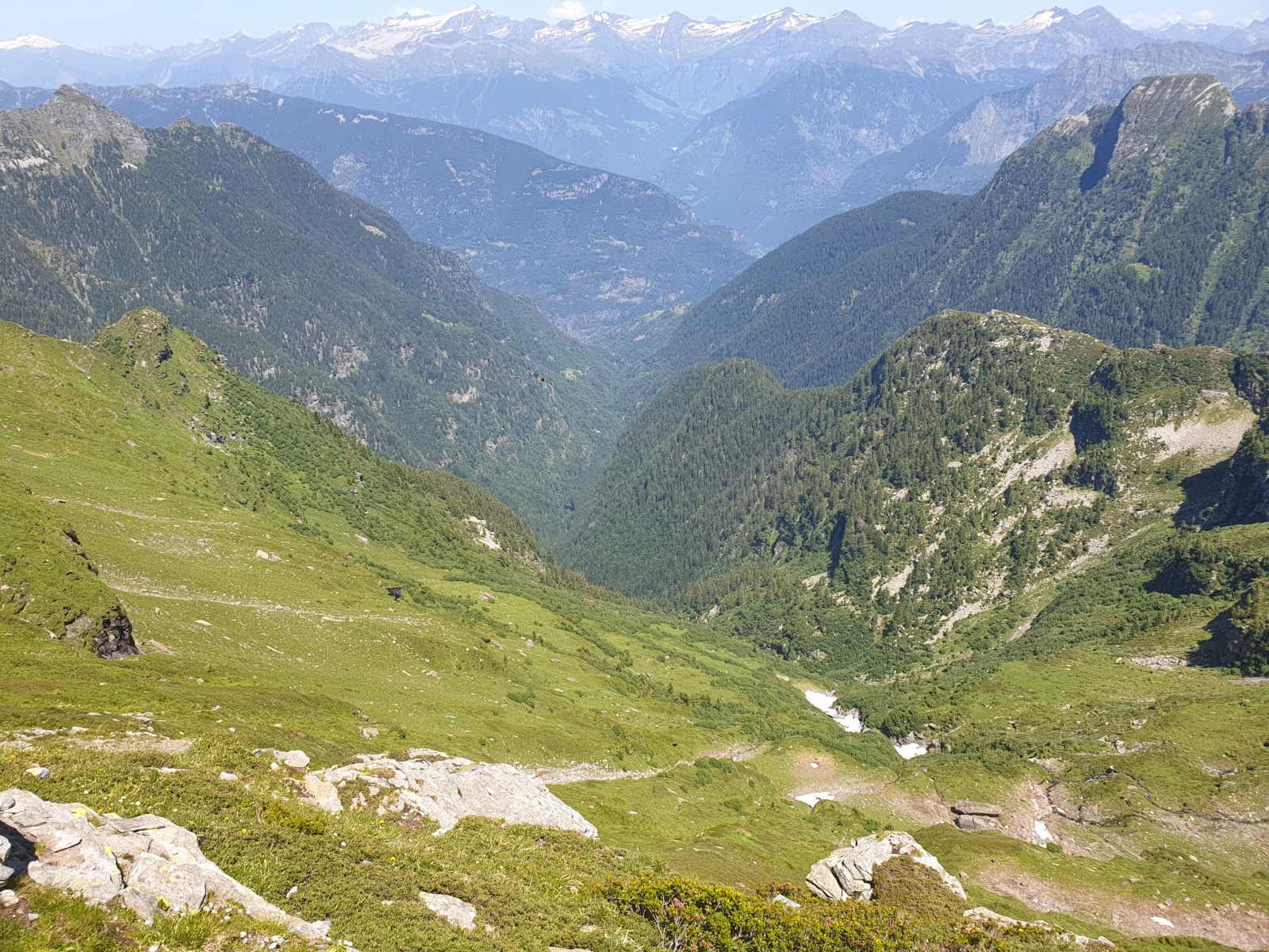 Mit der Bocchetta dello Scaiee hat man fürs Erste den westlichsten Punkt der ersten beiden Etappen erreicht. Danach quert man mit wenig Höhenverlust durch die steile und felsige N-Wand der Cima di Gagnone. Im Frühsommer kann da vermutlich noch recht lange Schnee liegen. Zum Passo di Gagno hinunter überquert man eine Schneetälchenlandschaft und lässt sich auf dem Wanderweg zur Capanna d’Efra tragen. Dort treffen wir auf viele Leute, welche die Hütte renovieren oder fürs leibliche Wohl der Handwerker sorgen. Es wird ein sehr gemütlicher Abend mit grünem Salat, rotem Wein und frischem Gemüse. Theoretisch könnte man noch ein Bad im Lago d’Efra nehmen, aber 200 Höhenmeter hin und zurück bräuchten beträchtlich viel Überwindung.