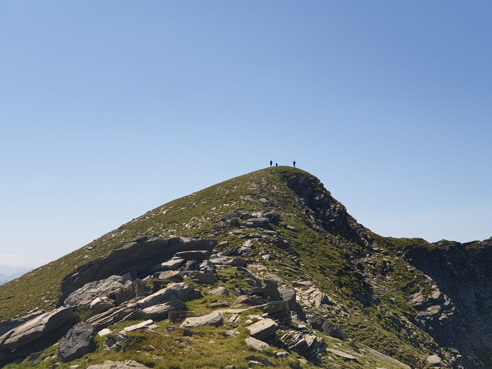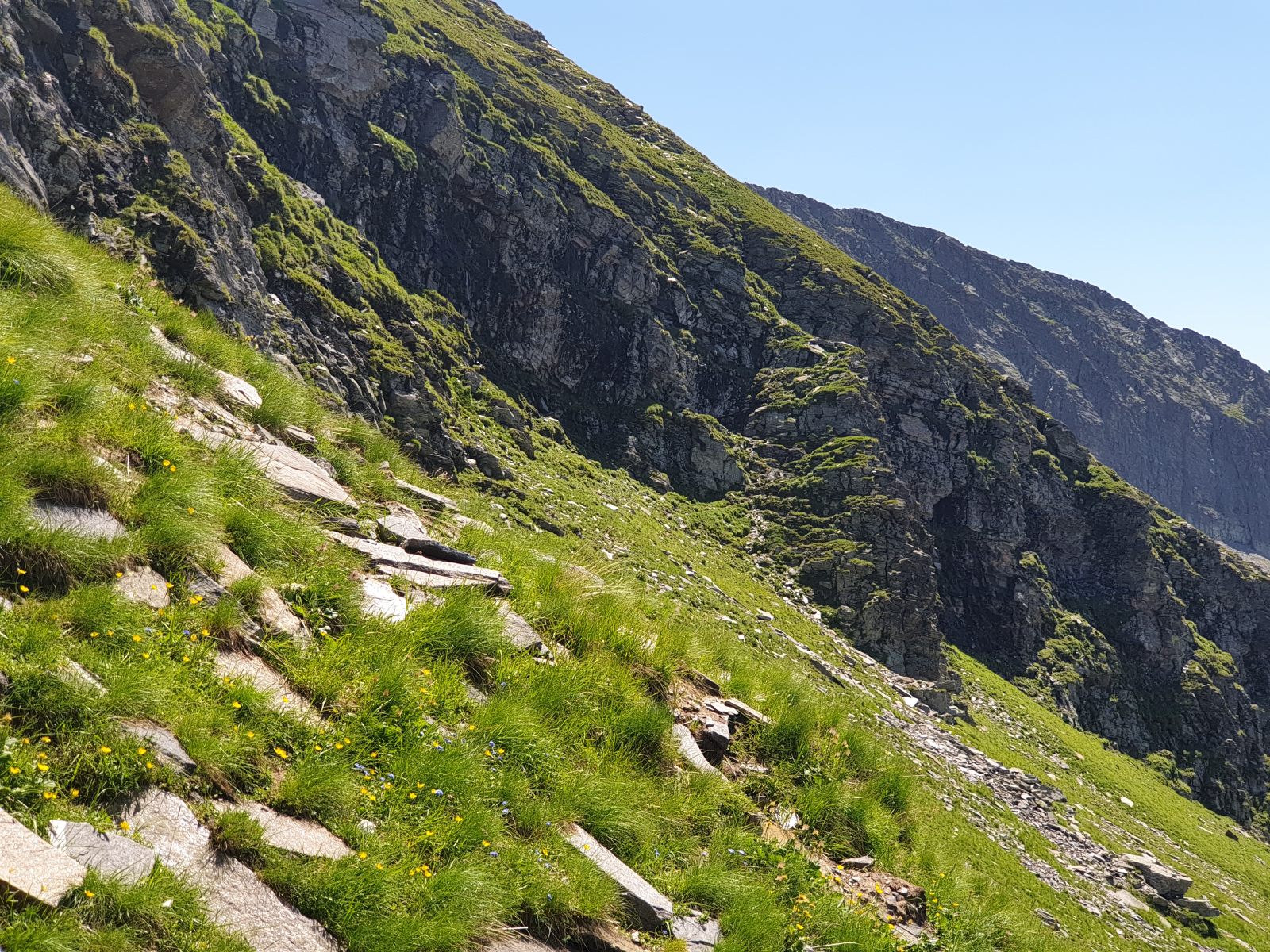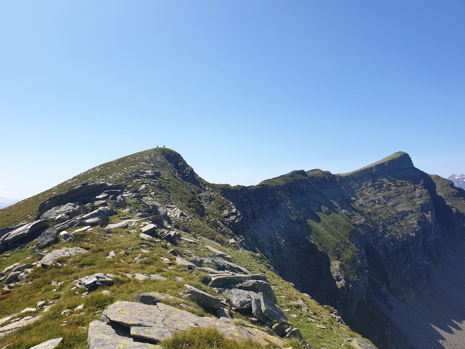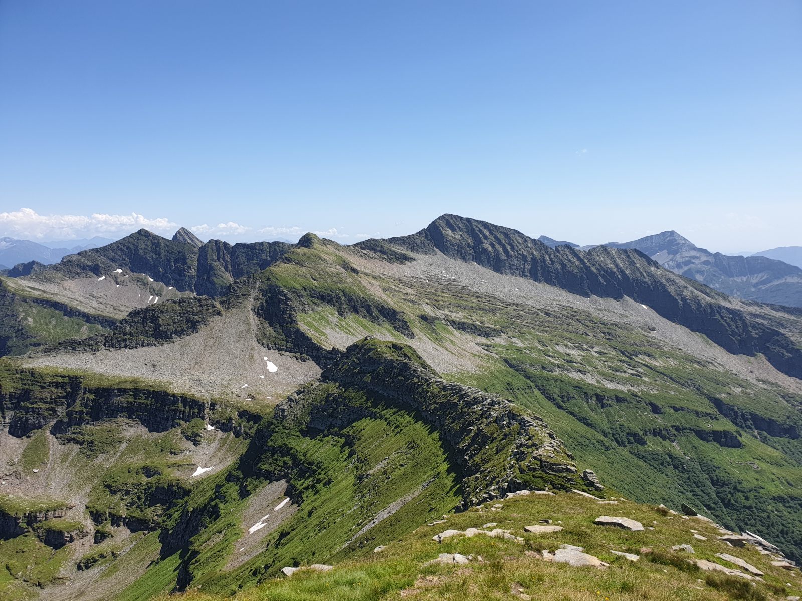 Der Aufstieg zur Bassa zählt zu den anspruchsvolleren Passagen. Die Kraxelei auf den plattigen Abschüssen hoch über Felsabstürzen ist recht anspruchsvoll und bei Nässe fast nicht passierbar. Die Kabel nimmt man dankend in die Hände. Nachher sind die technischen Schwierigkeiten fürs Erste vorbei, und man folgt dem Grat zur Cima Lunga, wo sich eine ausgesetzte Scharte einfacher überqueren lässt, als es auf den ersten Blick den Anschein macht. Danach umgeht man die Cima di Bri auf ihrer ostseitigen Terrasse, wo sich ein Schmelzwasserseelein befindet. Weiter dem Grat entlang zur Bocchetta di Rierna, vor welcher ein steiler und leicht ausgesetzter Abstieg zu bewältigen ist, weiter zur Cima di Rierna,