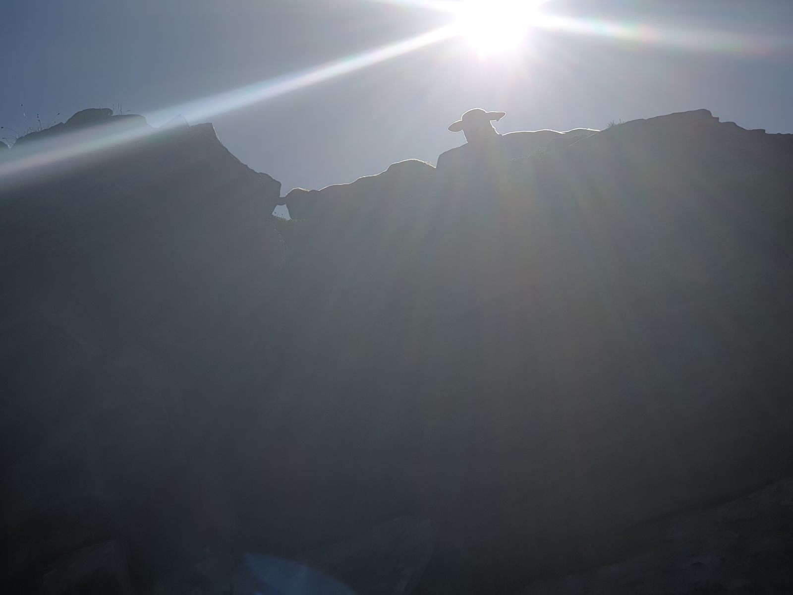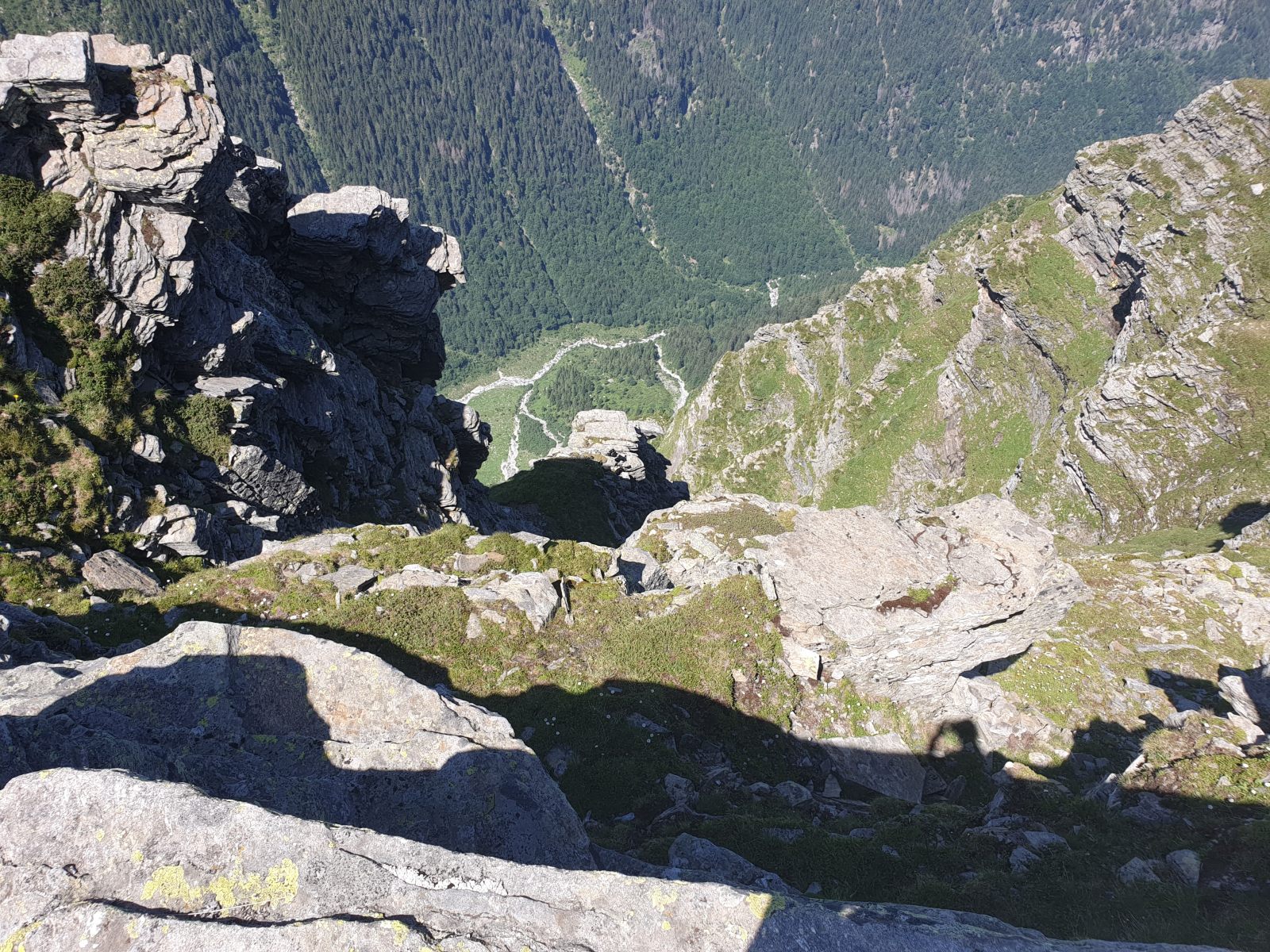 Dem N-Grat entlang steigt man über über sanftes Gelände ab bis kurz vor — eigentlich über — die Forcarella di Lodrino. Dort geht es erst 30 Meter tiefer weiter, und auf den ersten Blick frage ich mich, ob sich der Sprung in die Tiefe vermeiden lasse. Etwas zaghaft taste ich mich in der E-Flanke entlang eines Pfad tiefer, der sich bald als versicherter Abstieg erweist. Das Gelände ist recht ausgesetzt und dabei wird man ganz sicher wach!
