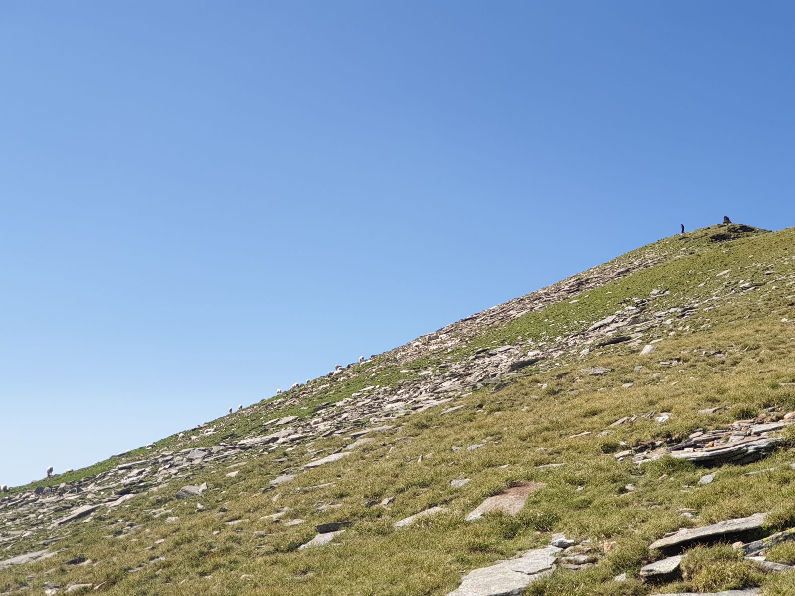 Von der Capanna Alpe Cornavosa traversiert die Originalroute zur Alpe Fümegna hinüber. Ich jedoch steche direkt von der Hütte den Hang hinauf und peile die S-Flanke der Scíma do Precastéll an. Zu meiner Überraschung ist die plattige Wand sogar weiss-blau-weiss markiert und stellenweise versichert. Das ist auch nötig, denn sonst würde das nicht mehr als Berg-Weg durchgehen. Man traversiert leicht ansteigend zur W-Kante und steigt über diese dann einfach zum S-Grat hoch, dem man bis zum Gipfel folgt. Etliche Kraxelstellen lassen sich vergnüglich erklimmen oder auch umgehen.