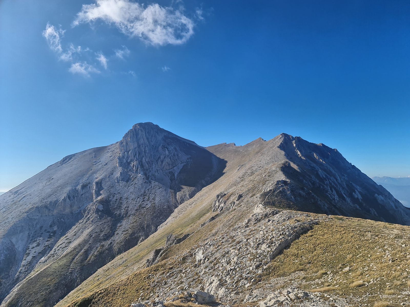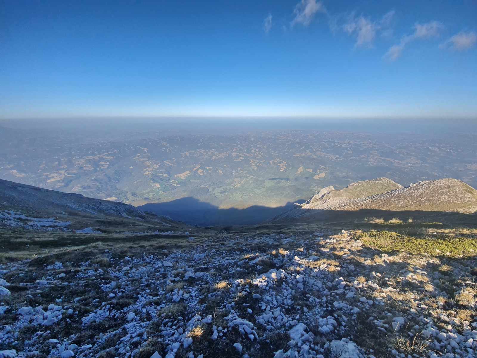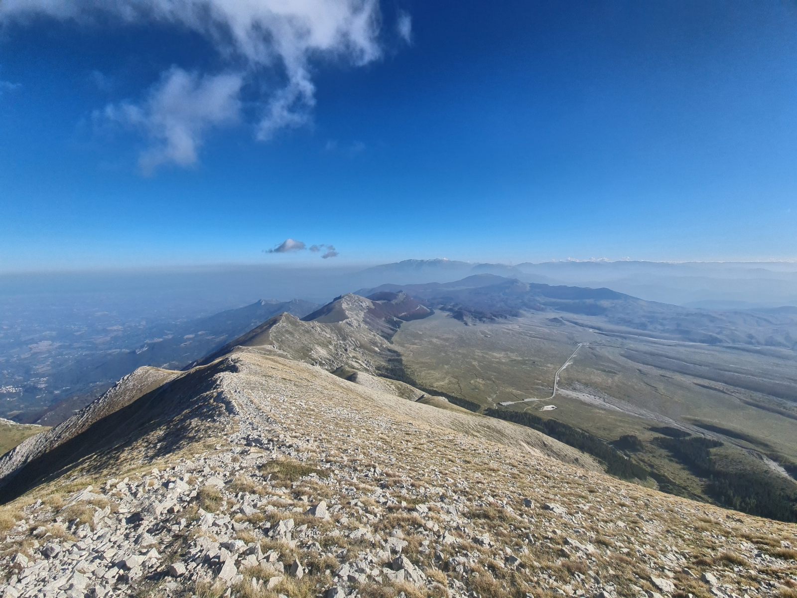 Von Campo Imperatore könne man absteigen und direkt zum Pässlein Vado di Corno gelangen. Diese Variante wird häufig vom Parkplatz an der Strasse aus gemacht. Reizvoller finde ich es jedoch, am Fusse des Gran Sasso zu beginnen. Das macht zwar eineinhalbe Stunde zusätzlich aus, bietet jedoch die einmalige Gelegenheit, sozusagen direkt über die Laboratori Nazionali del Gran Sasso zu laufen. Dort pflücke ich ein paar Wacholderbeeren, dich ich zuhause zum Gin of the Universe verarbeiten will. Immerhin handelt es sich dabei um die grössten unterirdischen Versuchslabore der Welt zur Untersuchung von Elementarteilchen. In Gesellschaft eines grossen Rudels Gämsen (Mistviecher!) lege ich dort eine Pause ein und studiere in ehrfürchtiger Stimmung den vor mir liegenden Kamm. Die ersten beiden Aufschwünge sehen noch mild aus und führen auf grüne Hügel. Dahinter erhebt sich jedoch ein langer und zerklüfteter Grat.