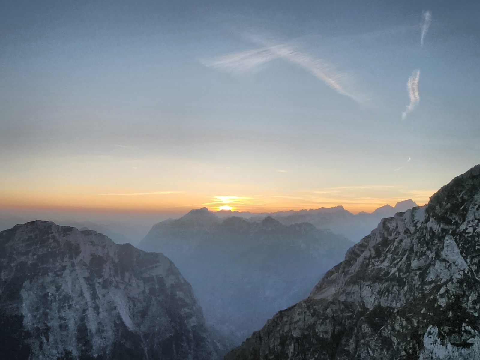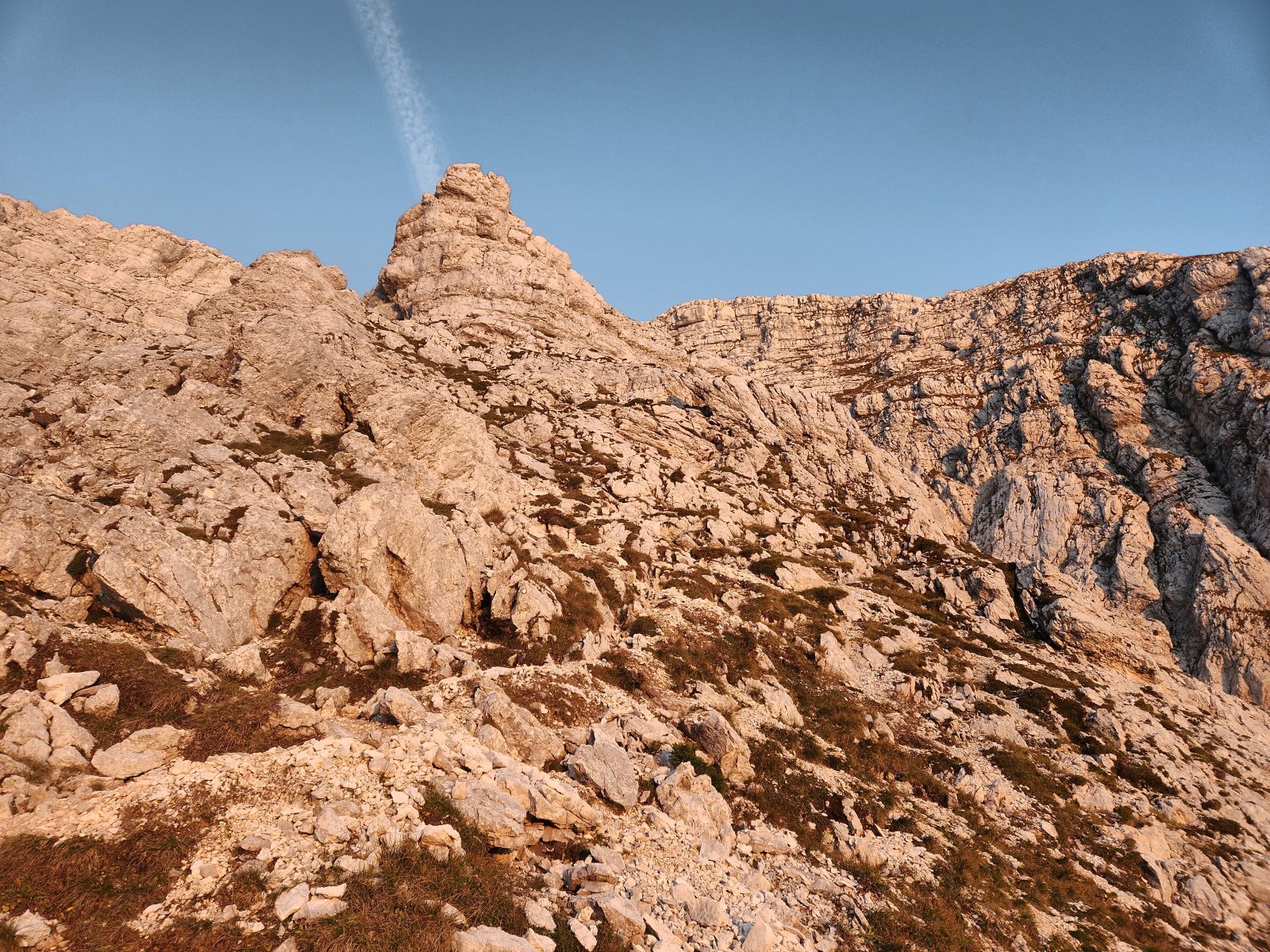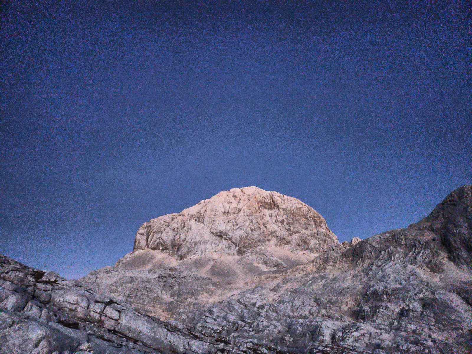 Der Rest des Aufstiegs ist ein Wettlauf gegen die Sonnenzeit. Pünktlich mit Einbruch der Dunkelheit lasse ich den Grat hinter mir und suche meinen Weg zum Planja-Plateau hoch. Von Wanderweg keine Spur, aber immerhin noch gut markiert. In diesem Karstgelände wäre ich sonst verloren. — Ich verstehe immer noch nicht, wie ein Kartenbild derart täuschen mag. In der Realität kurve ich über Felsrücken um Dolinen herum, ähnlich wie um Gletscherspalten. Erst weit oben erreiche ich die Schotterebene mit einem gut erkennbaren Weg. Allerdings währt die Freude nur kurz, den schon wenig unterhalb des Sattels verlasse ich den Pfad weglos in Richtung Südost.