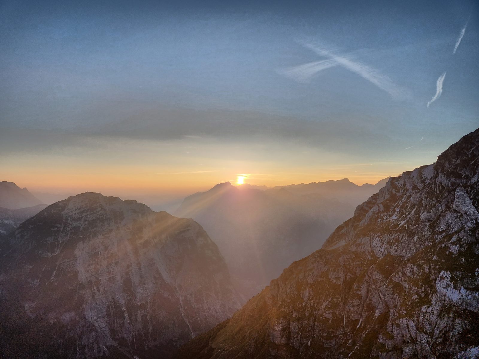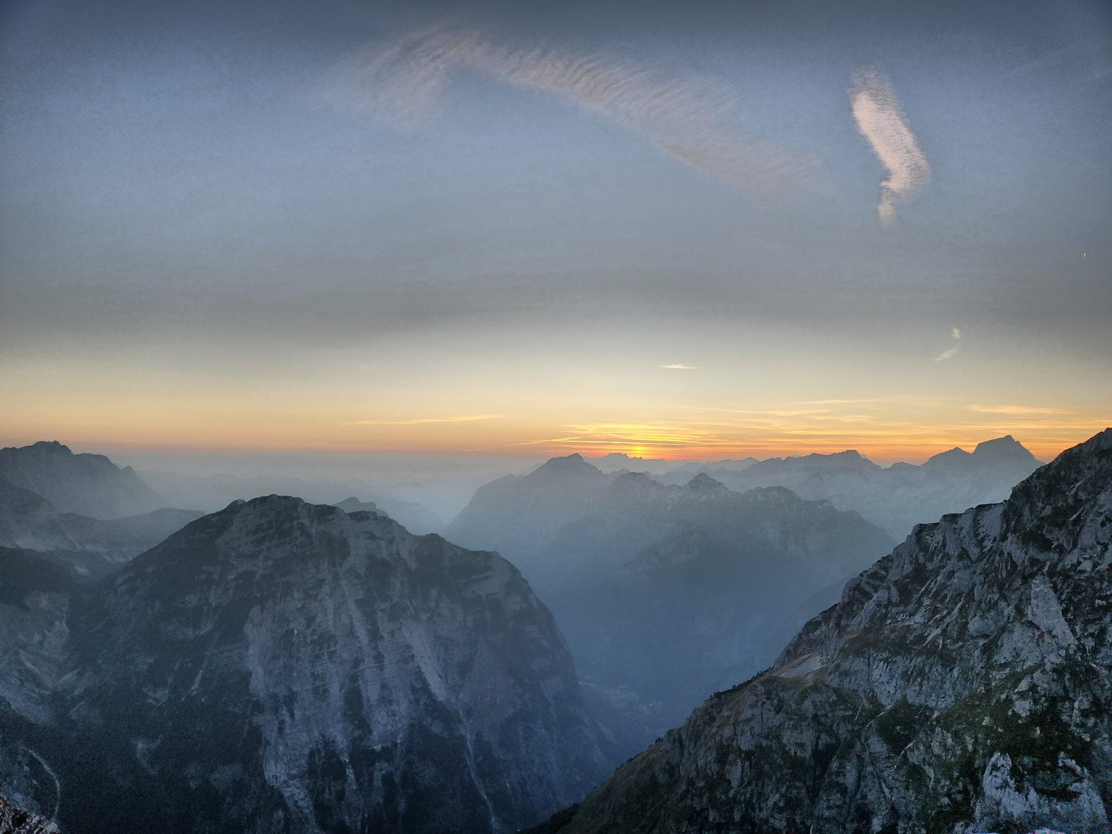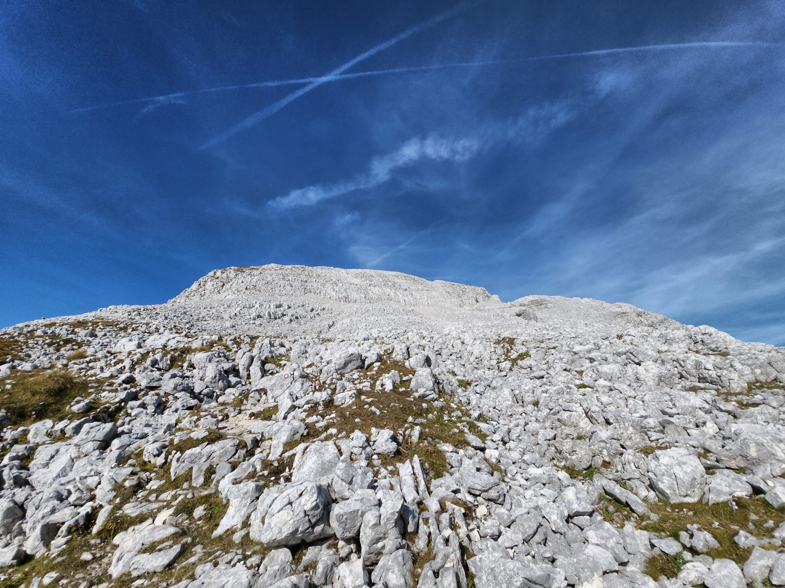 Der Rest des Aufstiegs ist ein Wettlauf gegen die Sonnenzeit. Pünktlich mit Einbruch der Dunkelheit lasse ich den Grat hinter mir und suche meinen Weg zum Planja-Plateau hoch. Von Wanderweg keine Spur, aber immerhin noch gut markiert. In diesem Karstgelände wäre ich sonst verloren. — Ich verstehe immer noch nicht, wie ein Kartenbild derart täuschen mag. In der Realität kurve ich über Felsrücken um Dolinen herum, ähnlich wie um Gletscherspalten. Erst weit oben erreiche ich die Schotterebene mit einem gut erkennbaren Weg. Allerdings währt die Freude nur kurz, den schon wenig unterhalb des Sattels verlasse ich den Pfad weglos in Richtung Südost.