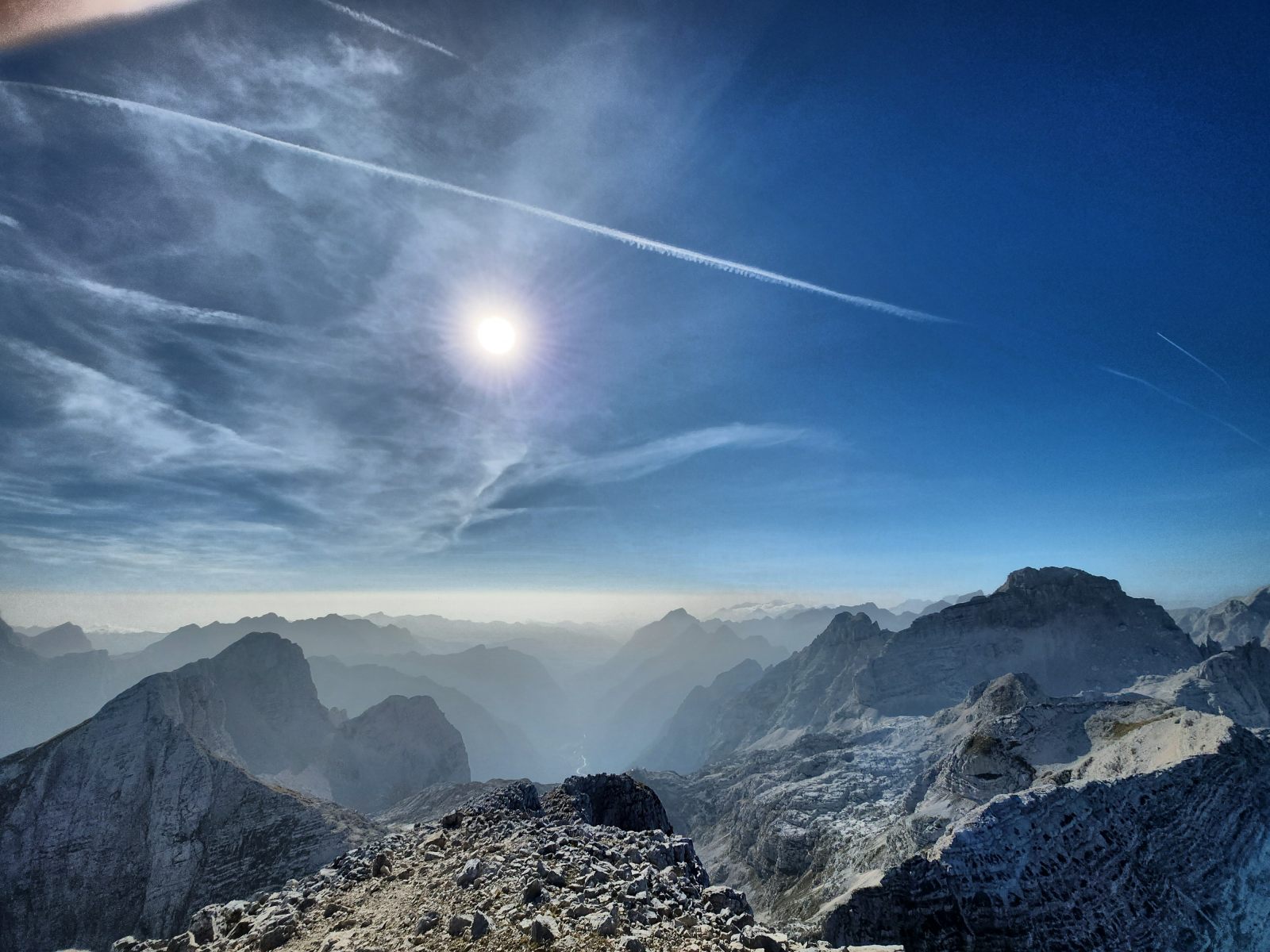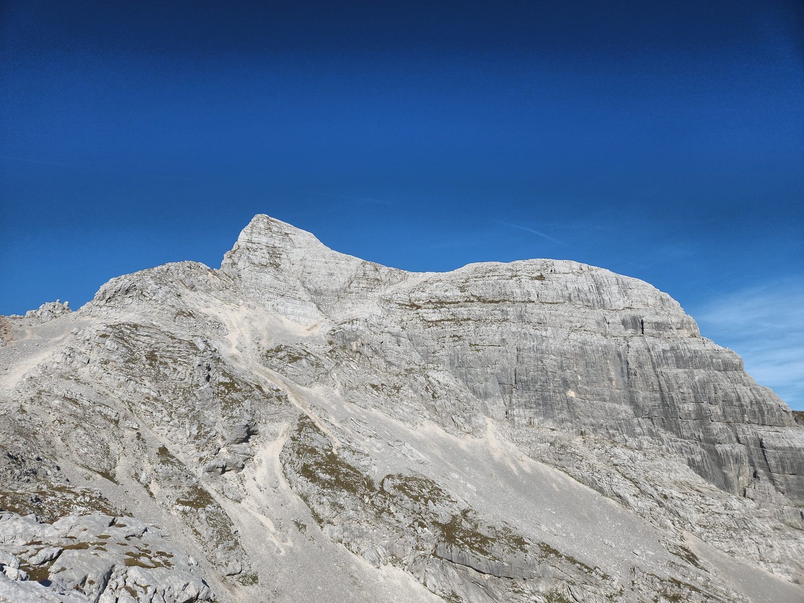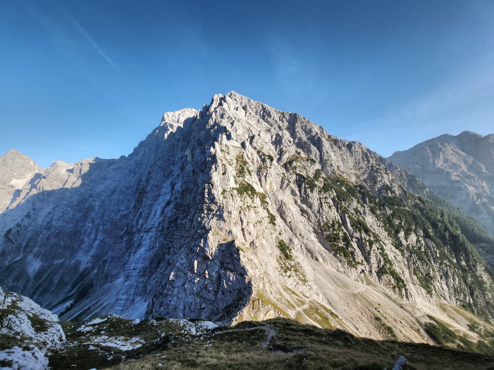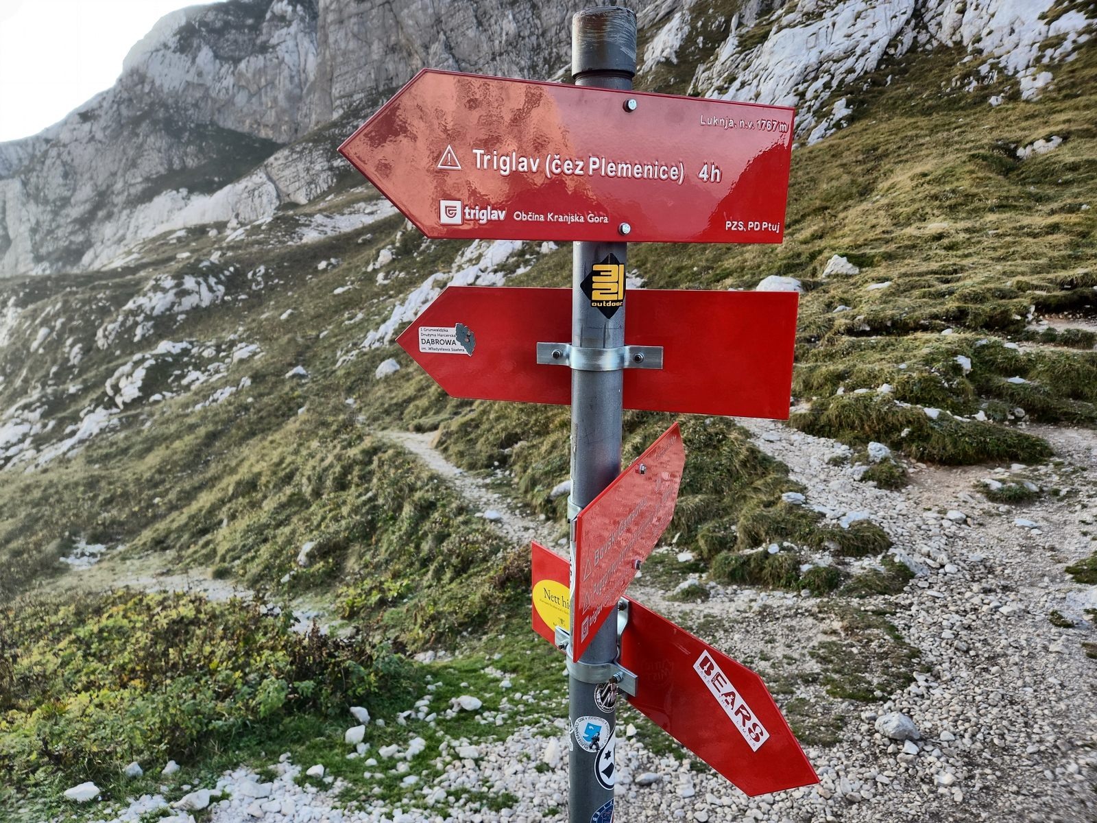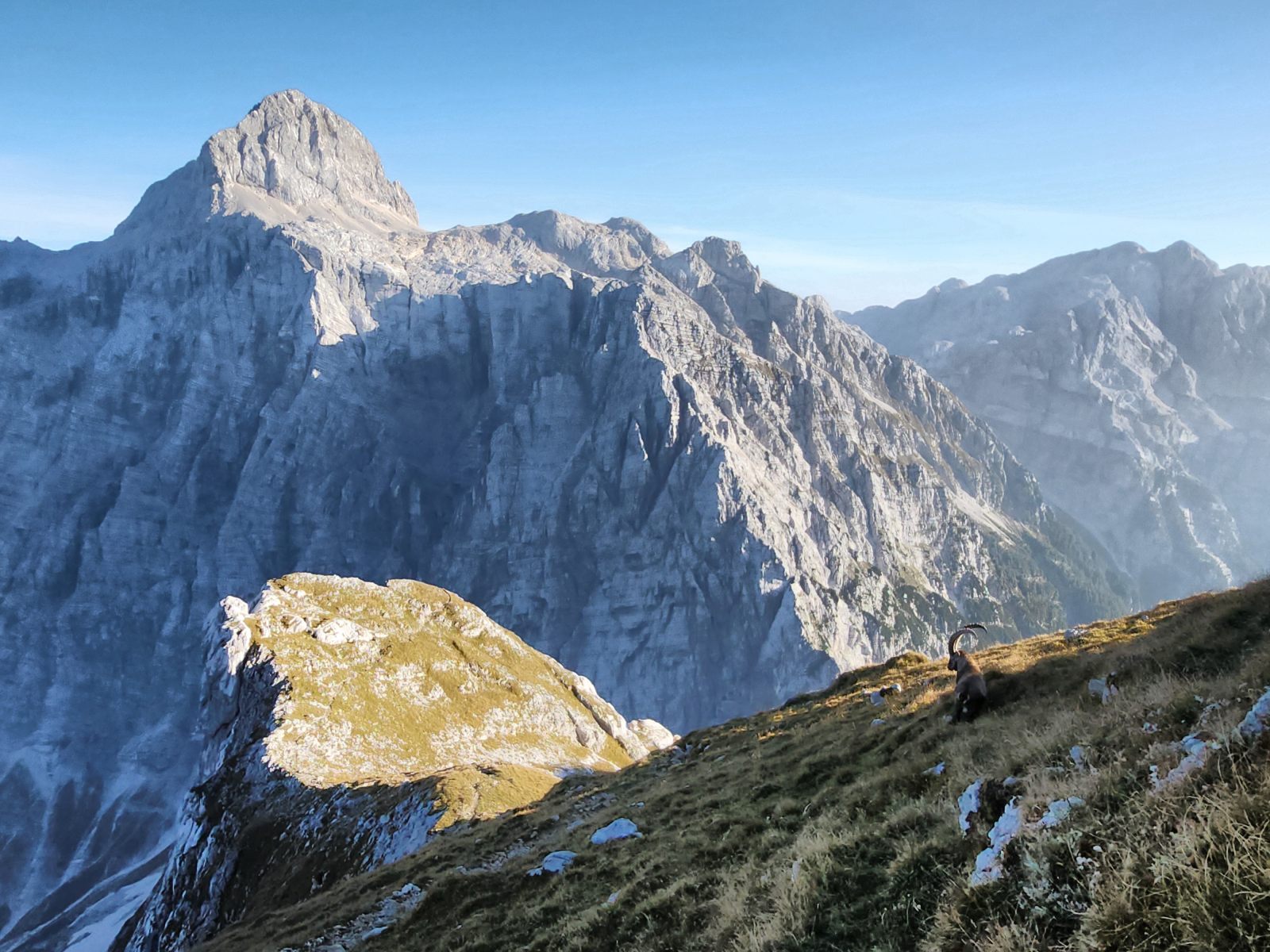 Prächtig insbesondere der Blick zum Triglav in der nahen Ferne, im Vergleich zur Ferne des Grossglockners. Lokal betrachtet ist eine beträchtliche Distanz zu überwinden, und die Lauflinie weicht erheblich von der Luftlinie ab. Also los! Der Rückweg ist bekannt, und mit Sack und Pack geht es hinüber zum Stenar. Erneutes Depot, kurz zum Gipfel hoch und wieder runter — nettes “peak bagging”.