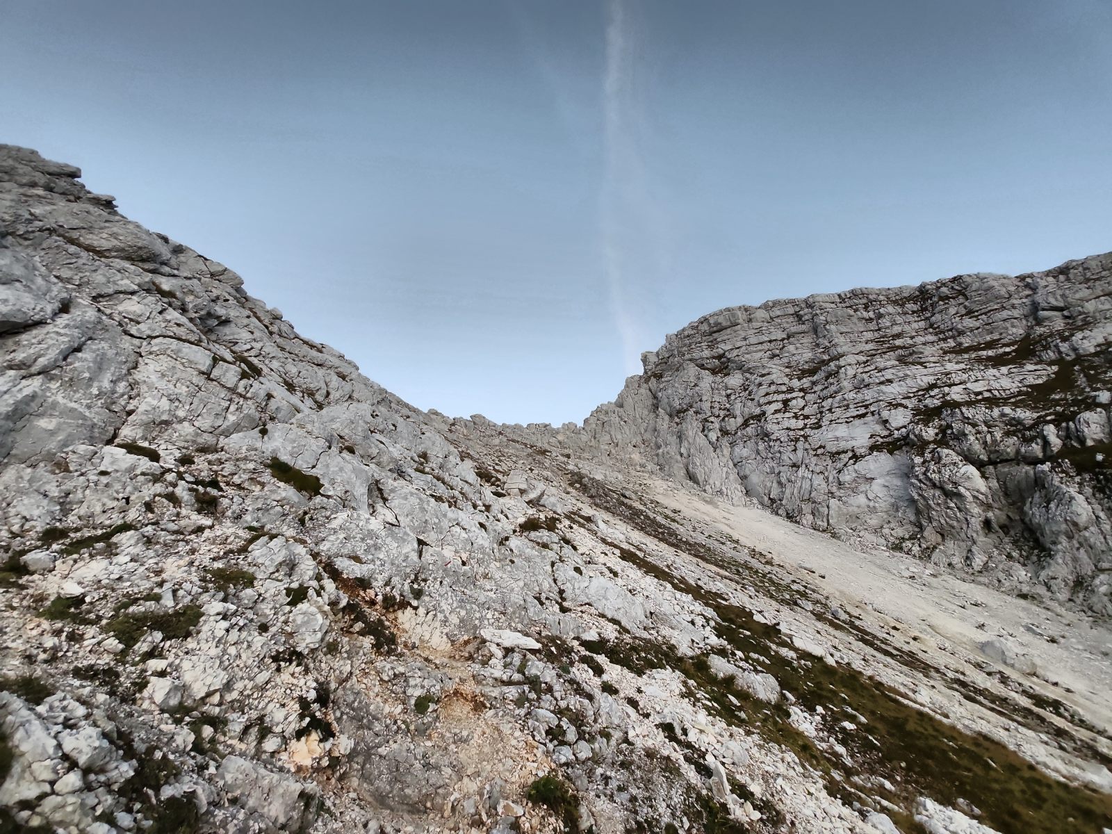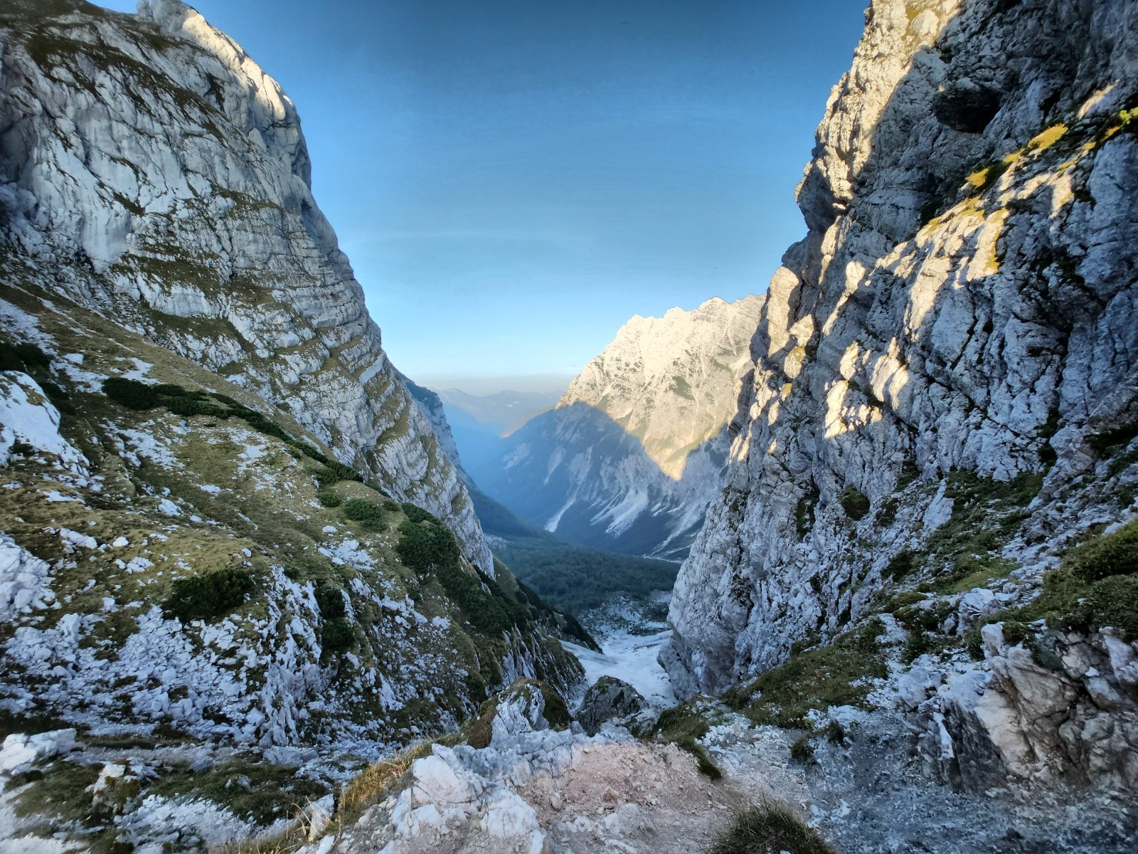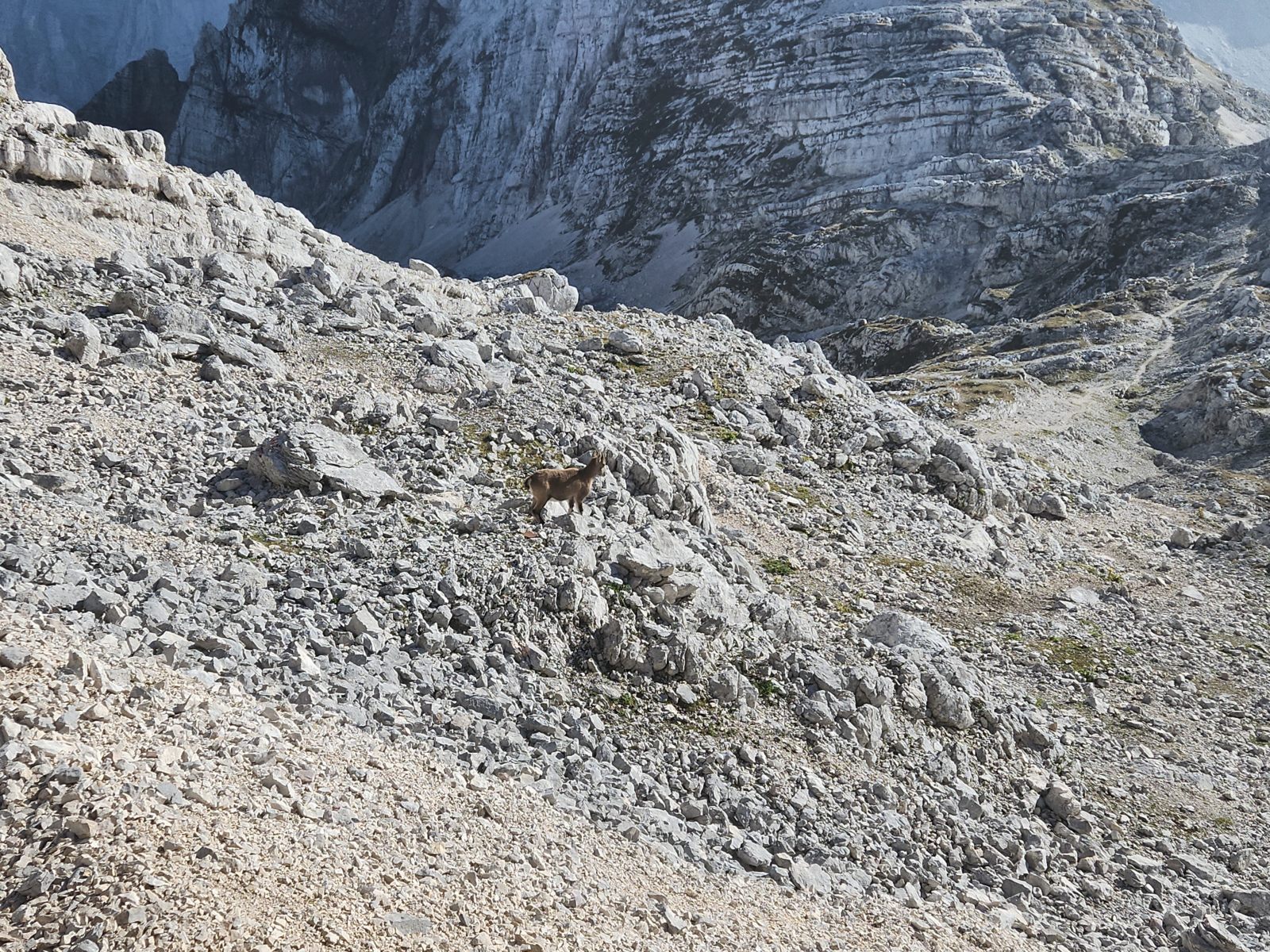 Ich folge der Westflanke des Rjavec und stosse ab und zu tatsächlich auf so etwas wie eine Pfadspur. Allerdings ist es in der Dunkelheit fast nicht möglich, ihr zu folgen, und so muss ich mich auf mein Gespür verlassen. Und das ist gefordert! Wie im Nachhinein zu befürchten, kämpfe ich mich über einen steilen Moränenschotterhang, der mit Dolinen und Felsrippen durchsetzt ist. Nichts von harmlosem Gehgelände, sondern Schotter im labilen Gleichgewicht. Ab und zu eine langgezogene Quermulde mit riesigen Felsblöcken, danach wieder ein tiefer Einschnitt. Endlich stosse ich auf einen ganz wenig weniger steilen Rücken, über den ich zum Wanderweg absteigen kann. Puh, das war sehr anstrengend!