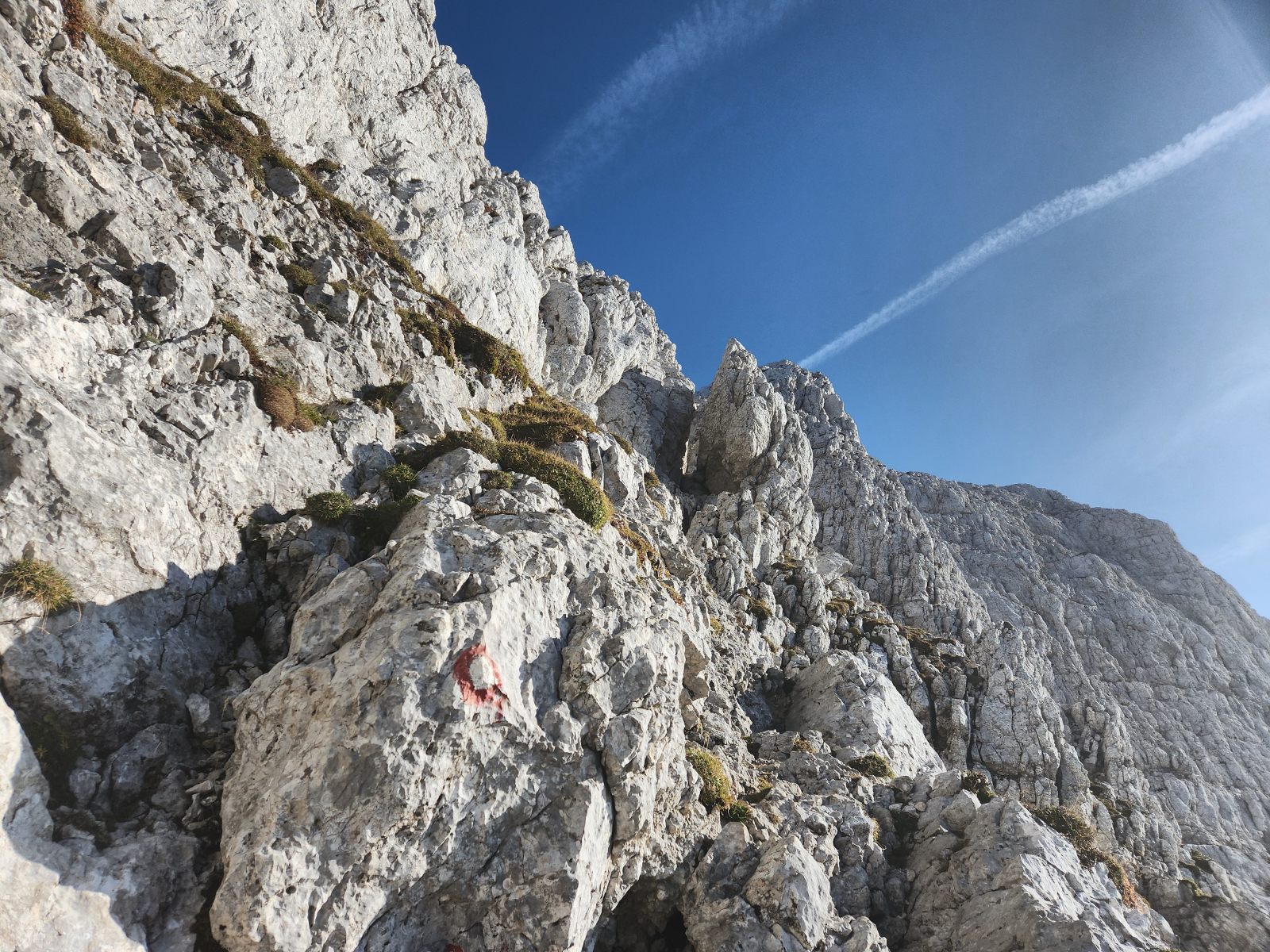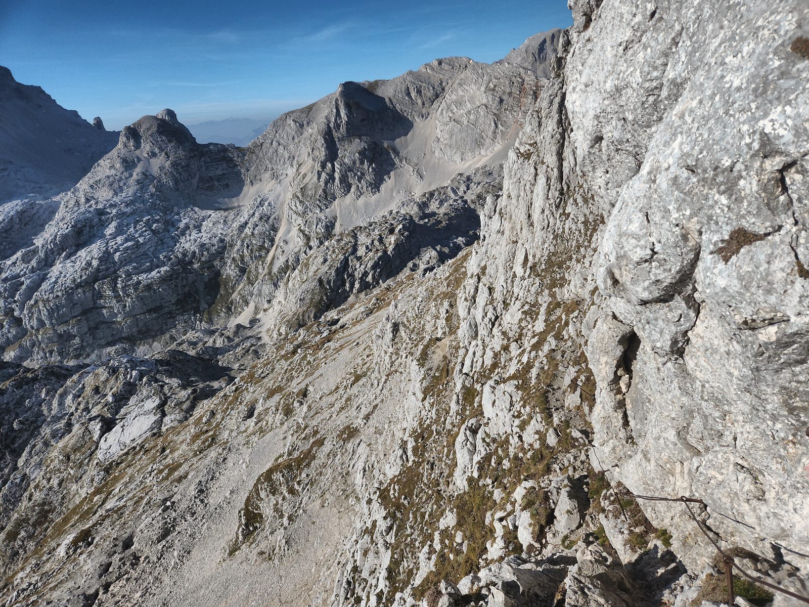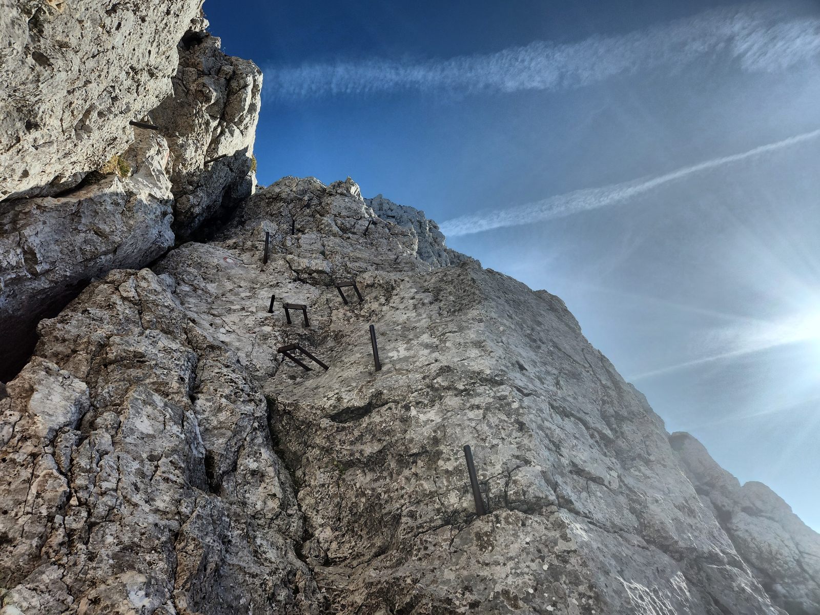 Der Steig ist, wie immer, bestens markiert und abgesichert. Er quert die Flanke in einer weiten Schleife, bevor man in ziemlich direkter Linie zum Gipfel hochsteigt. Die technischen Schwierigkeiten sind durchaus ansprechend, jedoch nirgends schwierig. Der Fels ist über weite Strecken wunderbar fest, und auch im geneigten Gelände ist der Untergrund nirgends schotterig. Im oberen Teil liegt etwas mehr Geröll herum, aber bei den wenigen Leuten, die ich heute antreffe, ist auch das kein Problem. Die Aussicht vom Gipfel ist in alle Richtungen prächtig.