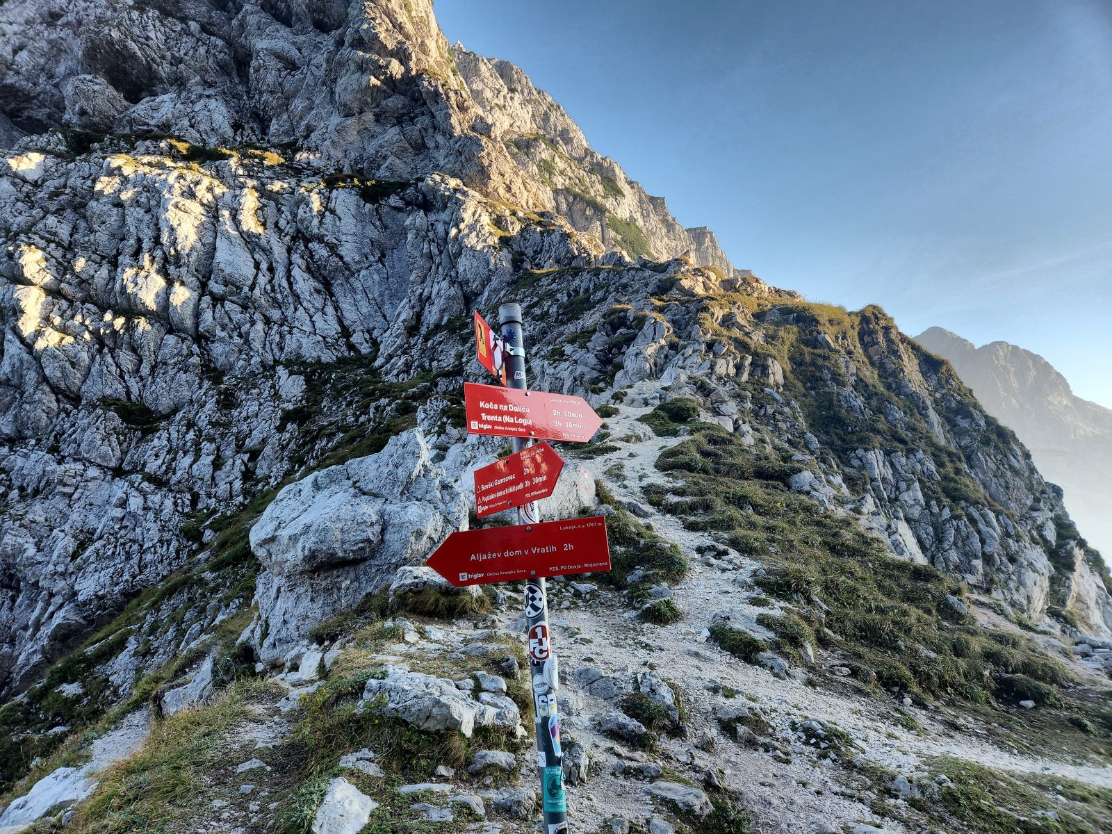 Endlich in der Luknja-Lücke. Es ist schon 17:30, aber das Wetter ist nach wie vor perfekt. Noch 1.5 Stunden bis Sonnenuntergang. Das sollte reichen, um den technisch anspruchsvollen Teil des Aufstiegs hinter mich zu bringen. Und danach sieht das Gelände gutmütig aus, sodass ich die Umrundung des Triglavs auch im Schein der Strirnlampe absolvieren könnte. Also los!