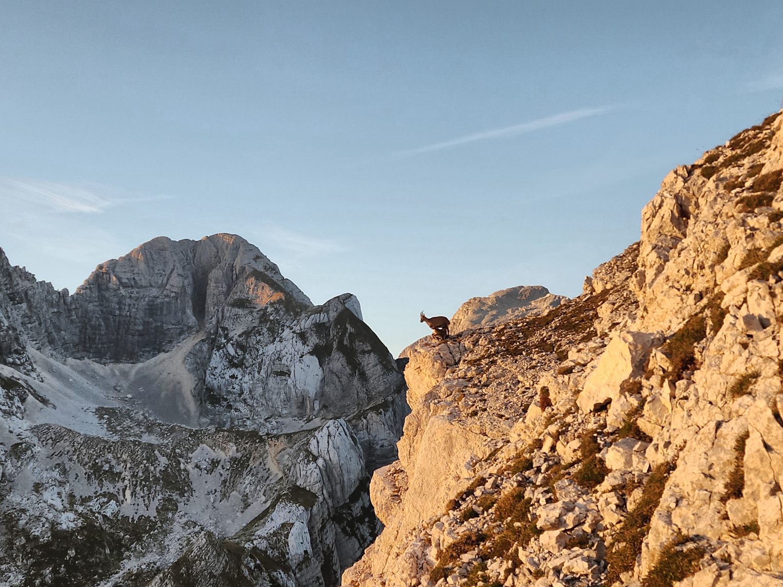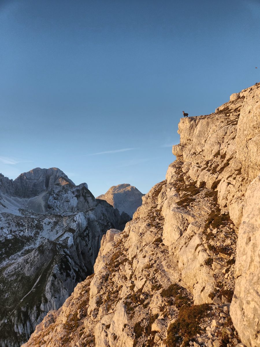 Der Weg über die Kante legt gleich recht kompromisslos los, und ich bin froh, dass die Steine fest sind. Der Aufstieg ist wirklich ernsthaft, und die Absicherung überhaupt nicht übertrieben, eher im Gegenteil. Ich arbeite mich hochkonzentriert empor und spüre förmlich die Schattengrenze unter mir hochkriechen. Im goldenen Abendlicht steht da eine Gams auf einem Felsvorsprung über dem Tal. Eine perfektere Idylle kann man sich kaum vorstellen. Ich hoffe nur, dass sie nicht Steine auf mich herunterlässt, und spute mich. Da springt unvermittelt ein Kitz heran, um sich zu säugen. Welch ein berührender Moment!